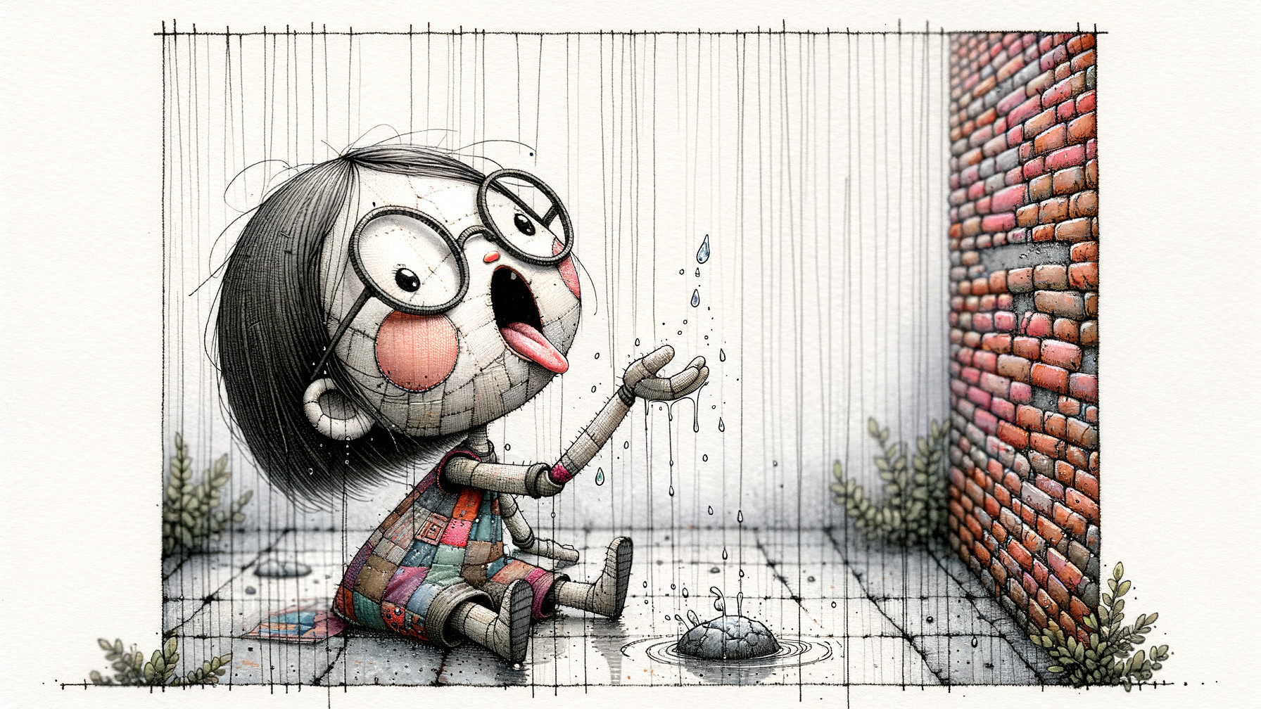 a young girl with large spectacles sitting on a small rock with her mouth open and her tongue out trying to catch raindrops on her tongue,
