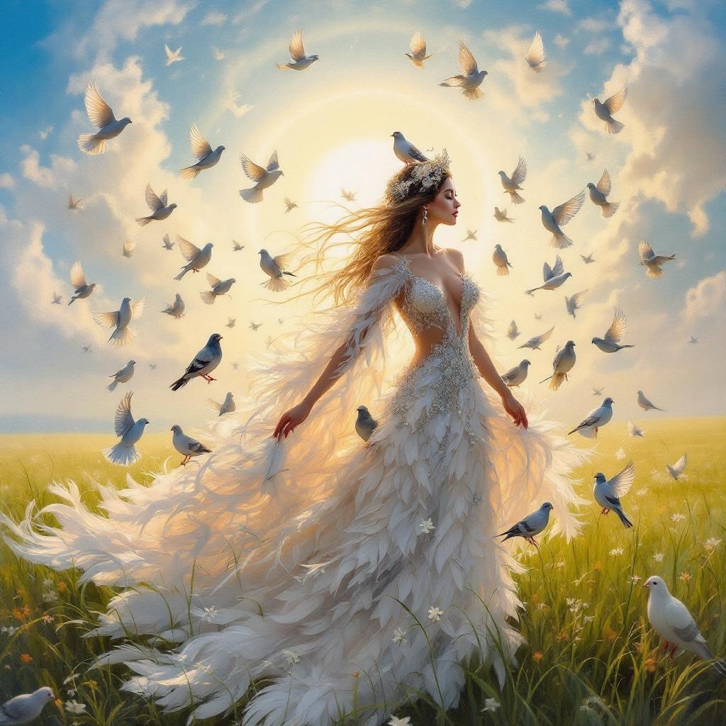 * Surrounding her gracefully – gentle movement, soft feathers rustling