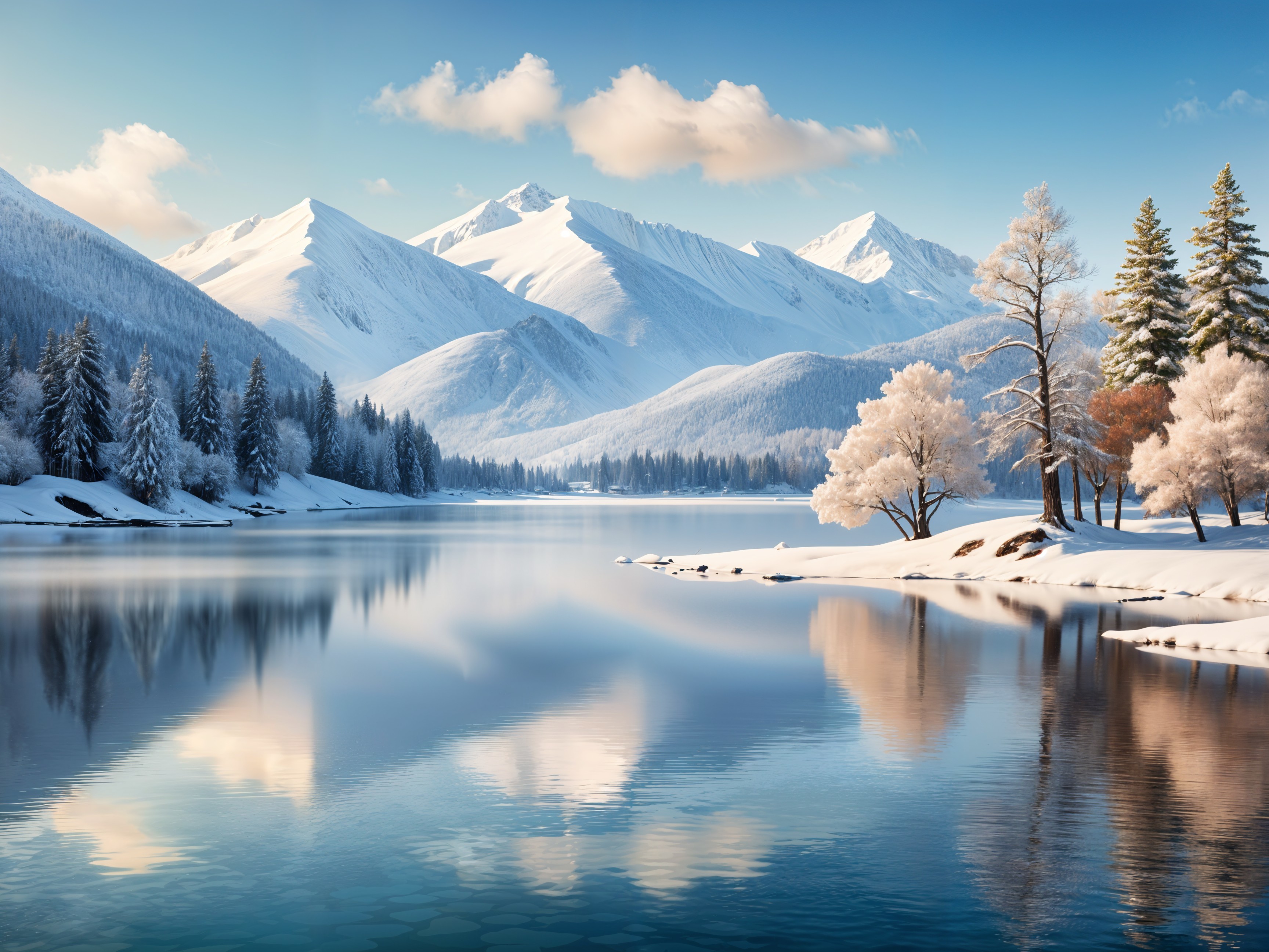 Prompt: Create a serene winter landscape featuring a calm lake surrounded by snow-covered mountains in the background. The scene should have tall, bare trees with snow-laden branches on the left side, partially reflecting in the still water. Design the foreground with patches of snow and small ice floes scattered across the lake's surface. Include a solitary tree on a small island slightly off-center, its reflection mirrored in the water. The overall color palette should consist of soft blues, whites, and gentle pastel tones, conveying a tranquil, dreamy atmosphere. Light snowflakes can gently fall from the sky, enhancing the wintery feel of the scene.