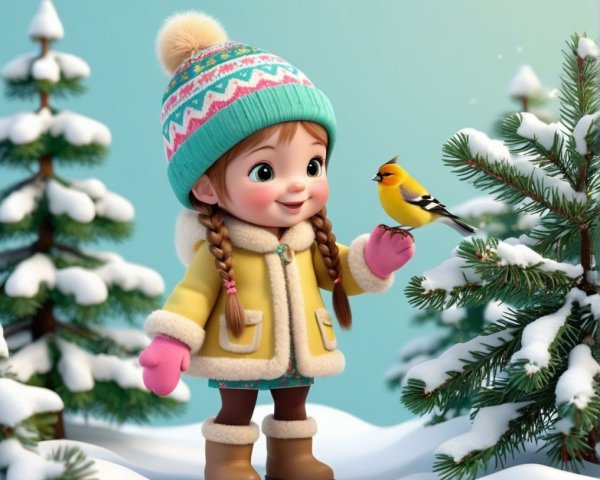 Prompt: A whimsical winter scene features a twisted, snow-covered tree adorned with playful white owls. The landscape is serene, with soft swirls of blue and gold creating a magical atmosphere.