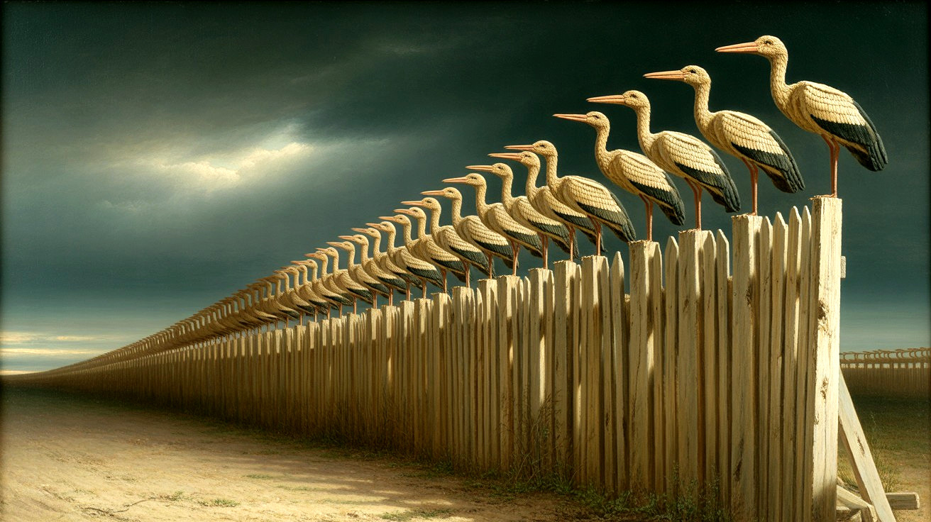 Prompt: an oil painting of an infinite straight fence line of identical wooden planks, each topped by a carved wooden stork body and head with wings by their sides, without legs, facing us, with barren ground in front of the fence, under dark sky, in the style of Egon Schiele, Gustav Klimt, Paul Klee