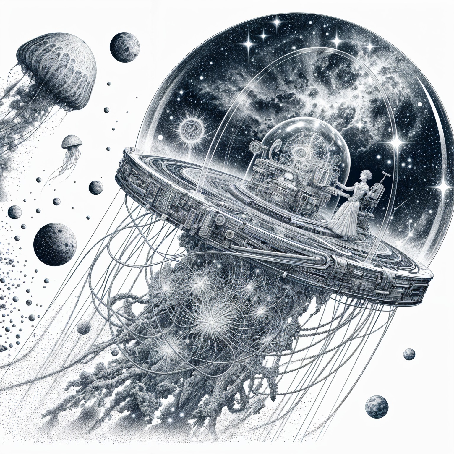 A colossal, crystalline jellyfish drifts through a cosmic void, its tendrils trailing nebulae and stardust. Within its translucent bell, a gorgeous female with short red hair resides, operating equipment powered by bioluminescent flora. The style is highly imaginative, blending cosmic surrealism with the sharp, clean lines of vector art, evoking a sense of wonder and alien beauty.