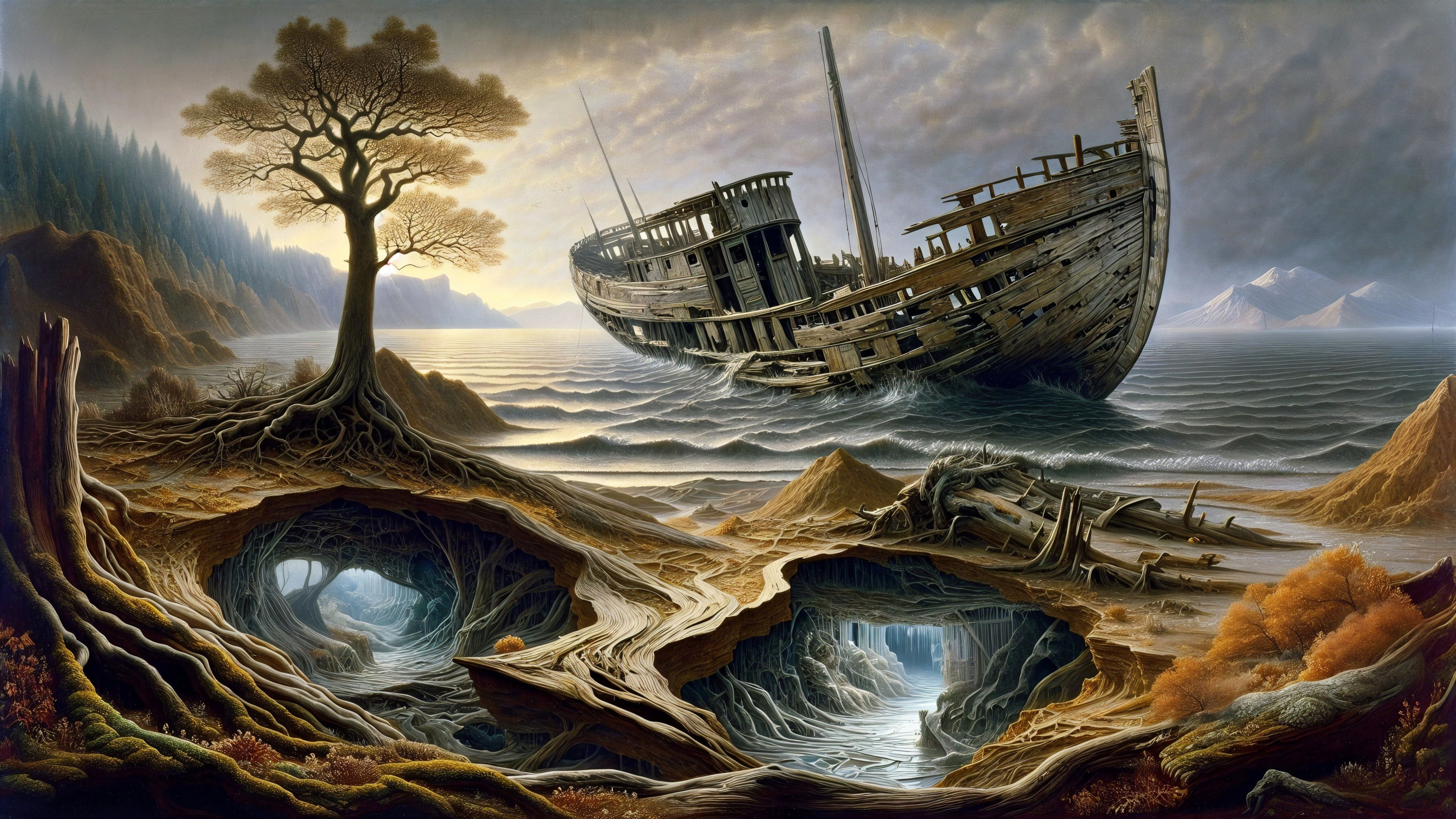 Prompt: A surreal painterly scene set along a strange, weather-worn shoreline where, in the distance, the hull of an old wooden wrecked ship rests partially embedded in the land. The ocean pours forward in a continuous surge that spills across cracked soil, as though the tide itself has been redirected from its natural path. Within the translucent segments of the terrain, a silver river winds through shifting inner realms, revealing glimpses of soft misty forest light and shallow glowing water, each layer suggesting hidden depth beneath the surface. Along one side of the scene, the remains of a finely crafted ship lean beside an ancient oak tree, its fractured structure subtly mirrored across the aged and weathered surfaces surrounding it. Thick roots coil around the lower shell of the hull, binding it securely to the ground as if nature has claimed and preserved it over time. The composition carries the tonal discipline of the old masters, supported by a warm inner radiance that gently illuminates the central forms. A quiet, desaturated background reinforces the scene’s sense of stillness, while the overall visual language includes stylistic influences reminiscent of renowned surreal and painterly artists, emphasizing depth, texture, and refined atmospheric detail.