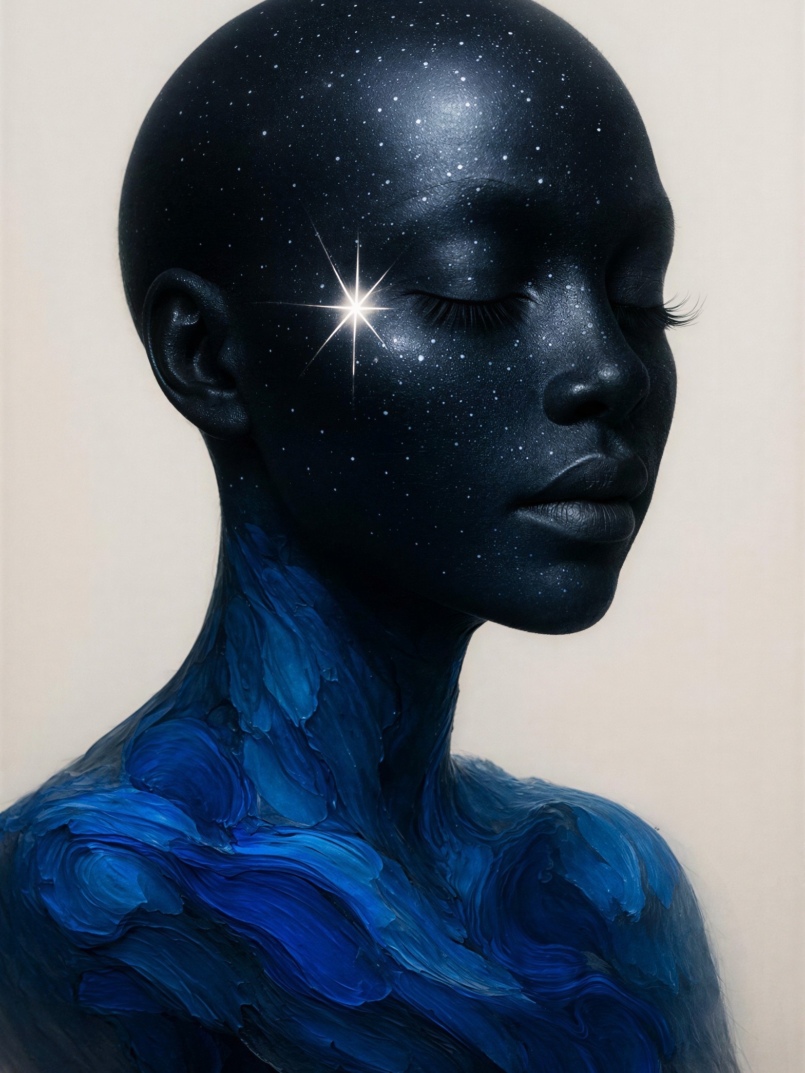 Ink lines rare elegant and curved, guiding rather than cutting. The mood is confident, intelligent, and quietly mythic — a close, intimate vision of power rendered through harmony, restraint, and fluid abstraction.