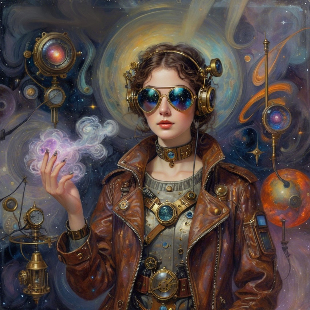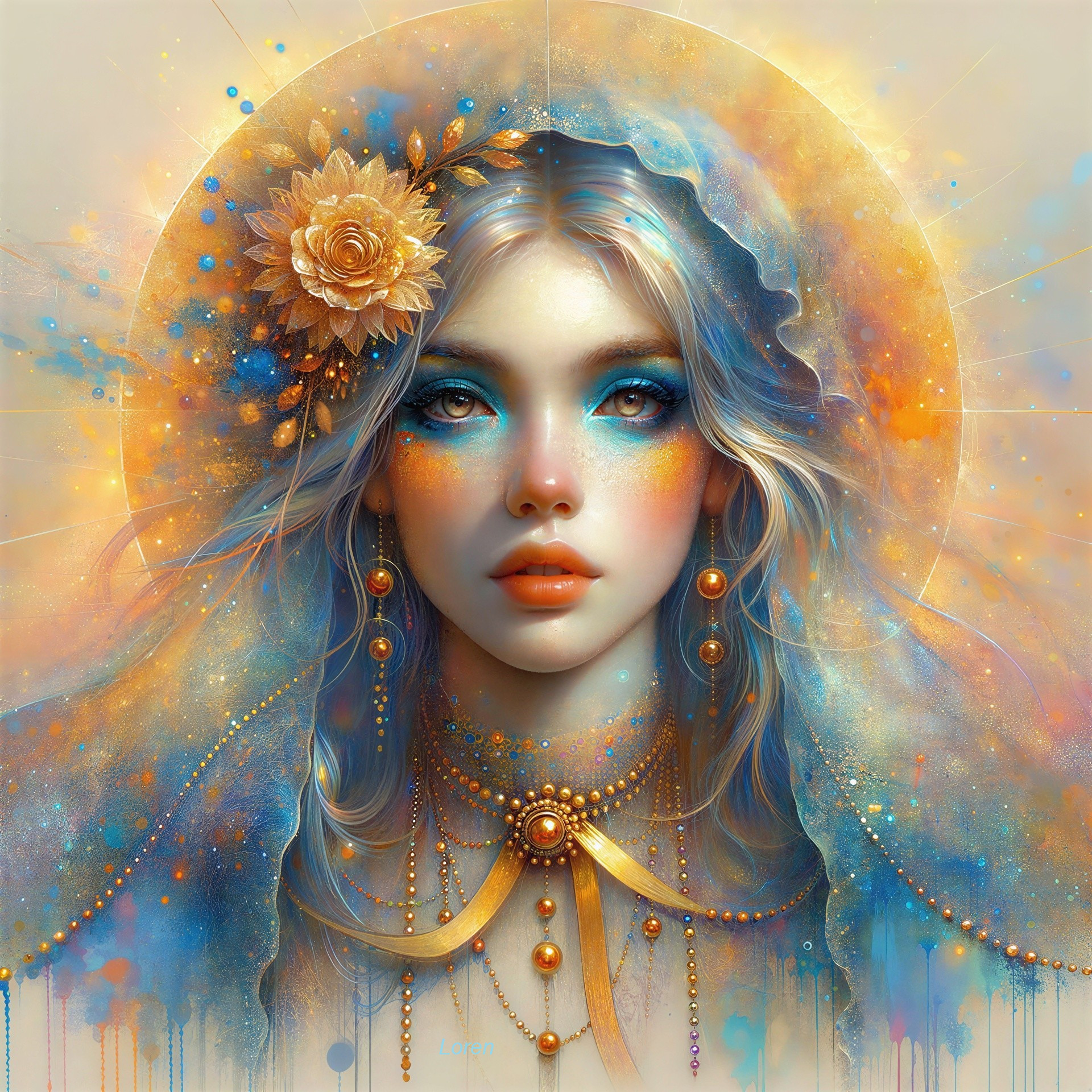 Prompt: ((((Masterpiece)))), an artistic portrait of a woman, rendered in a celestial fusion of ink, pen, and alcohol ink on a ground of iridescent gold. The composition follows the Golden Ratio in an asymmetrical layout, where everything dissolves into intricate abstraction. Her alluring gaze and features emerge from a storm of splashing, blotting, irregular strokes, and squiggly lines. The technique blends the soft, flowing brushstrokes of classical etching with the extreme intricacy of 70s adult European comic art. Her form is defined by extremely intricate fine lines that suggest realism before dissolving into op-art patterns. She is adorned in a dress of [creams, gold foil, copper foil, sapphire], rendered with deep rich colors and heavy Art Deco brushstrokes that recall Klimt and Jean Metzinger. The palette swirls with light pinks, light yellows, beige, gold, and light greens against a profound black background. The smallest details are saturated with light: rich rim light carves her silhouette, an inner glow pulses from within, and volumetric light sculpts her form. The surface shimmers with sequins, glitters, crystal dust, and platinum dots, as if made of Alex Grey's Murano glass or Kandinsky's vibrant harmonies. The overall effect is one of luminous dissolution a glowing, abstracted figure where Pino Daeni's warmth meets Egon Schiele's rawness in a breathless, oversprayed dream.