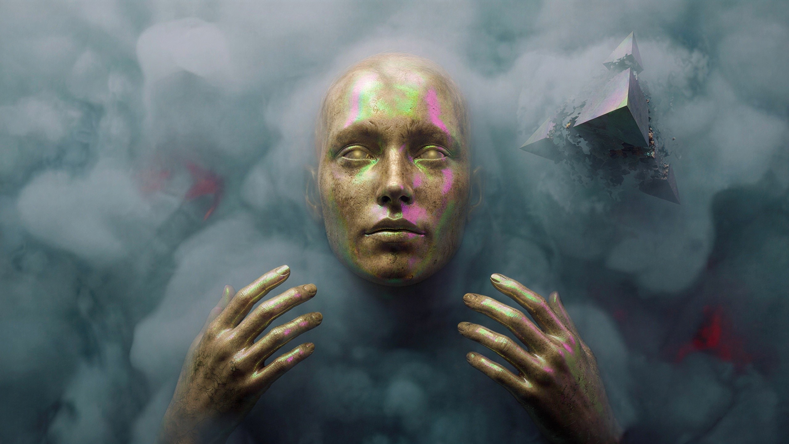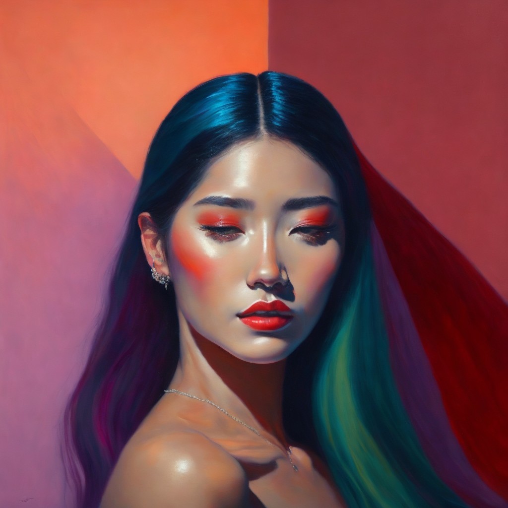 Prompt: n this abstract painting, geometric shapes dominate, creating an impression of depth and space. At the center of attention is a stylish female profile, smoothly integrated into the composition. Her features are highlighted by a dark palette, ranging from black to shades of gray.