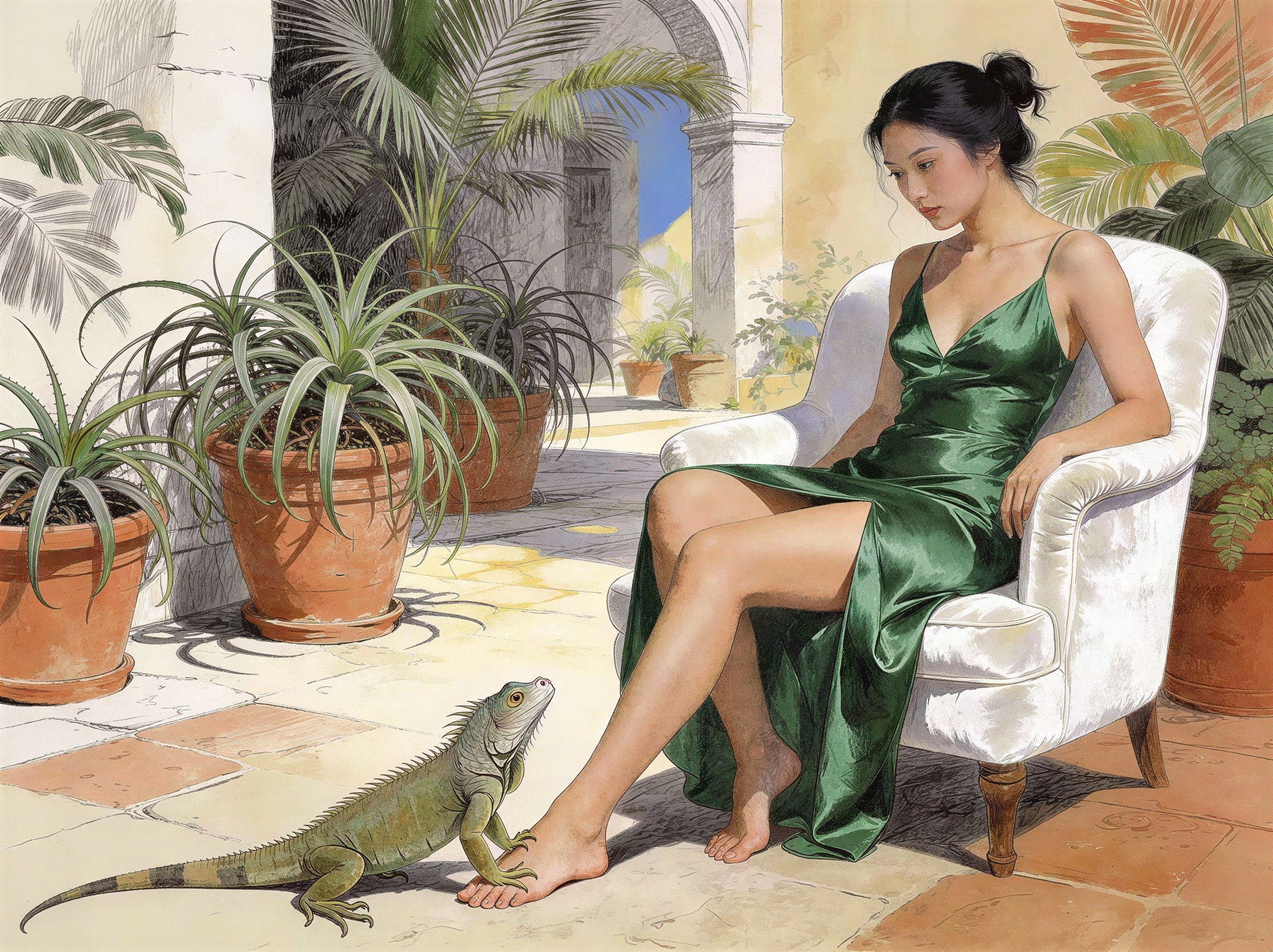 Prompt: A minimalist close-up illustration composed according to the golden ratio, rendered in a liquid, expressive mixed-media style with translucent wet-on-wet alcohol inks, pouring medium, fine ink lines, and softly controlled abstract splashes. The spiral composition draws the eye from open negative space toward the subject’s gaze, creating a sense of quiet dominance and visual inevitability.