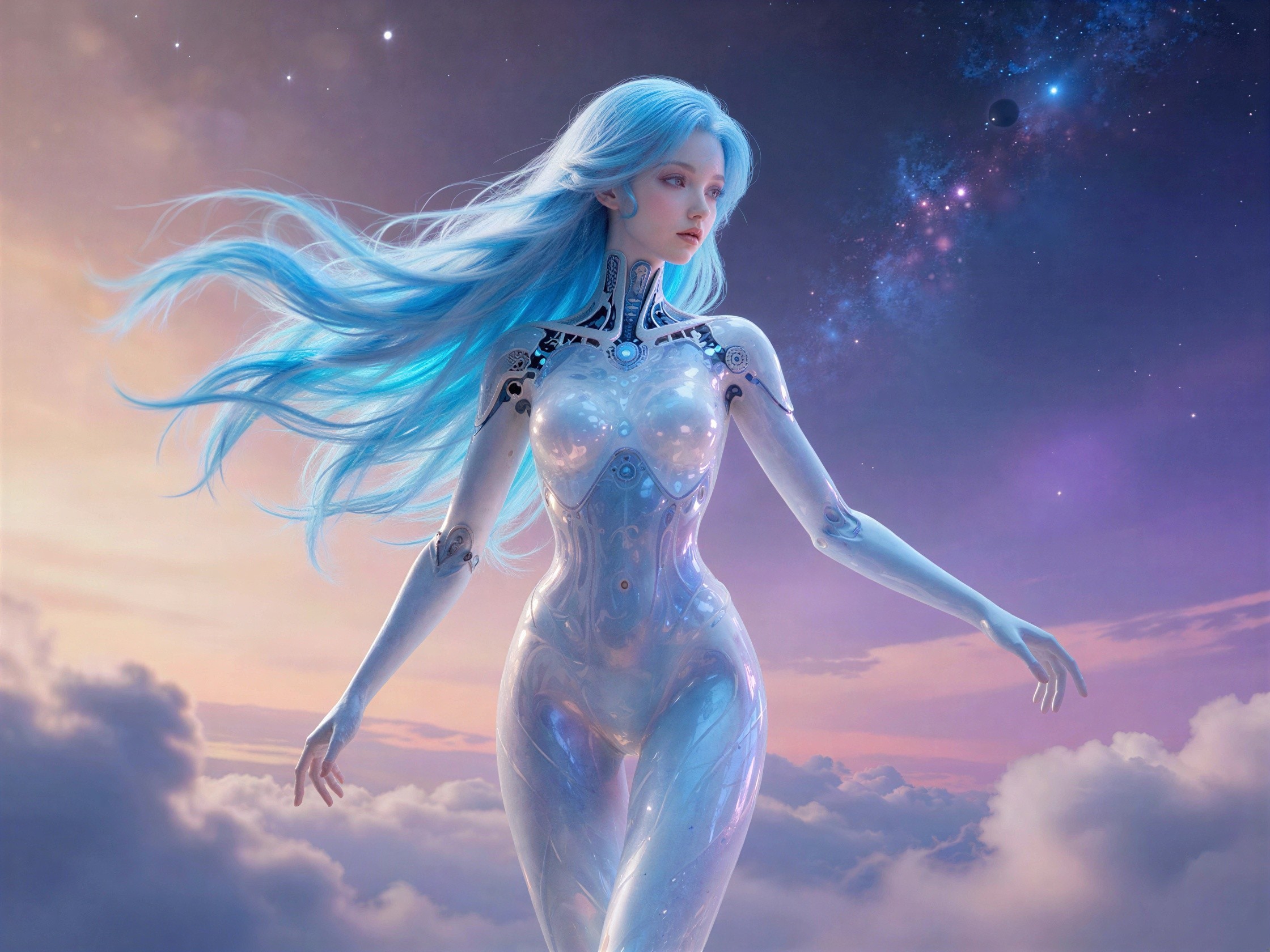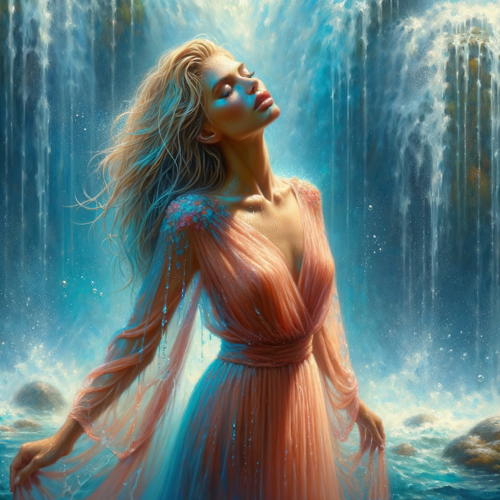 Prompt: Create beautiful whimsical and ethereal aesthetic, using watercolor techniques to create a dreamy, lighthearted, and fantastical mood. Key Aesthetic Elements Medium and Technique: The primary medium appears to be watercolor, evident from the transparent and fluid washes of color that bleed and blend into one another. The background uses a wet-on-wet technique, where paint is applied to a wet surface, resulting in soft, organic edges that create an atmospheric, dreamlike composition. Whimsical Quality: The style is characteristic of whimsical art, a genre known for its imaginative and fanciful nature, often featuring playful or fantastical elements like fairies or surreal landscapes. The swirling white lines around the figure enhance the sense of movement and magic, suggesting wind, water or energy. Color Palette: The palette is vibrant and uses a mix of cool greens and blues in the background, contrasted with the warm orange and red of the figure's dress. This creates a vivid visual statement and adds energy to the piece. Texture and Detail: The work includes subtle details like small dark speckles and tiny white dabs, possibly made with opaque white paint (gouache) or an iridescent medium, which adds texture and a sense of "twinkling lights" or light reflection to the otherwise soft composition. This combination of fluid washes, vibrant colors, and fantastical subject matter creates an aesthetic that transports the viewer to an imaginative and enchanting world. masterpiece extremely detailed