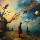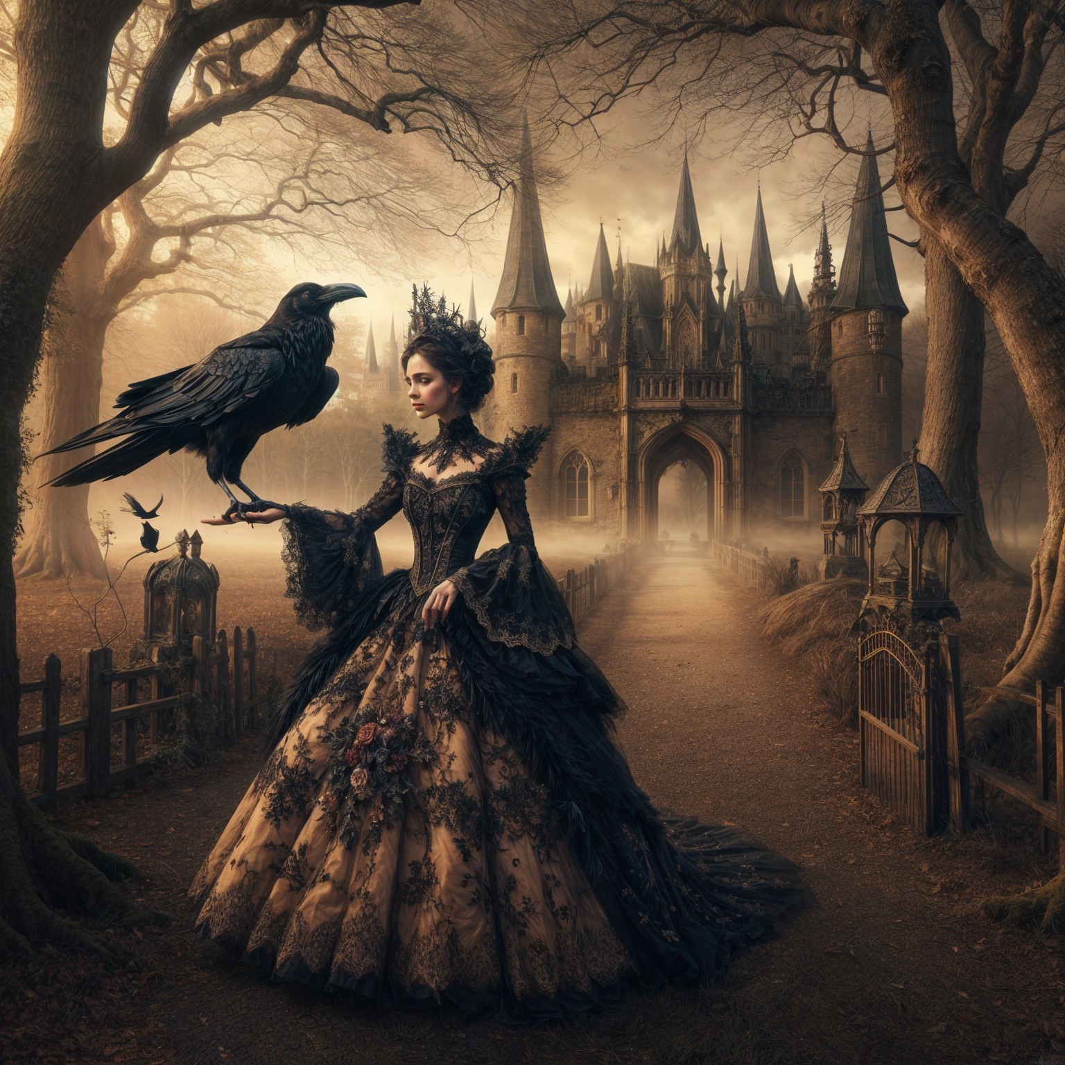 Prompt: In a misty, enchanted forest, from behind a beautifully dressed woman in an elaborate black gown holds the hand of a large, majestic raven and walk. The atmosphere exudes a whimsical yet eerie atmosphere, characterized by a soft, diffused light reminiscent of the golden hour. The background reveals an imposing Gothic castle with multiple spires and towers, partially obscured by thick fog, enhancing the mystery of the scene. The path leading to the castle is lined with dimly lit trees, whose branches overhang the path to create a natural setting. The raven, adorned with bright feathers, contrasts with the dark dress, adorned with delicate lace and floral embroidery. The painting adopts a romantic yet somber artistic style, influenced by Gothic aesthetics and elements of fairy tales. Its color palette consists mainly of muted browns, blacks, and soft grays, in keeping with the mysterious theme. The composition is structured around the figures of the woman and the raven, which guide the eye towards the threatening castle in the distance, arousing intrigue and wonder. The technical execution is similar to that of oil painting, with fluid brushstrokes creating a dreamlike effect.