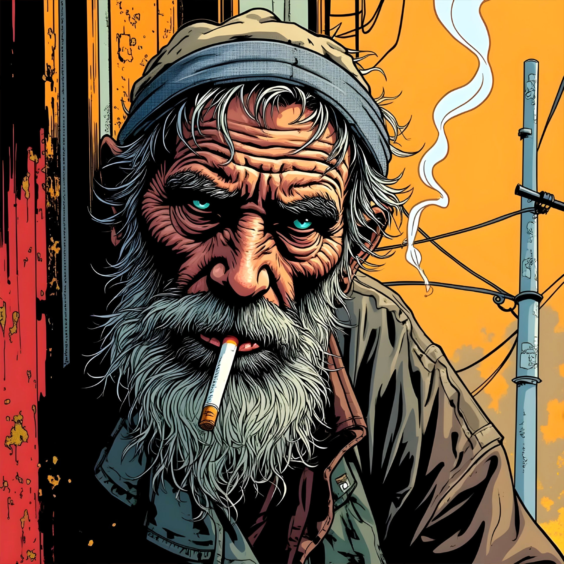 Prompt: Worn Down by Life: Contrast comic image of a worn old homeless man with a long grey beard and a lit cigarette dangling from his mouth, his facial features etched with deep wrinkles and a rugged skin tone, wearing tattered and layered clothing, set against a gritty urban backdrop with bold lines and vibrant colors, the overall aesthetic is a satirical commentary on social issues, with the old man's eyes cast downward, his face a picture of resilience and hardship, the cigarette smoke wafting upward, adding a sense of melancholy to the scene.