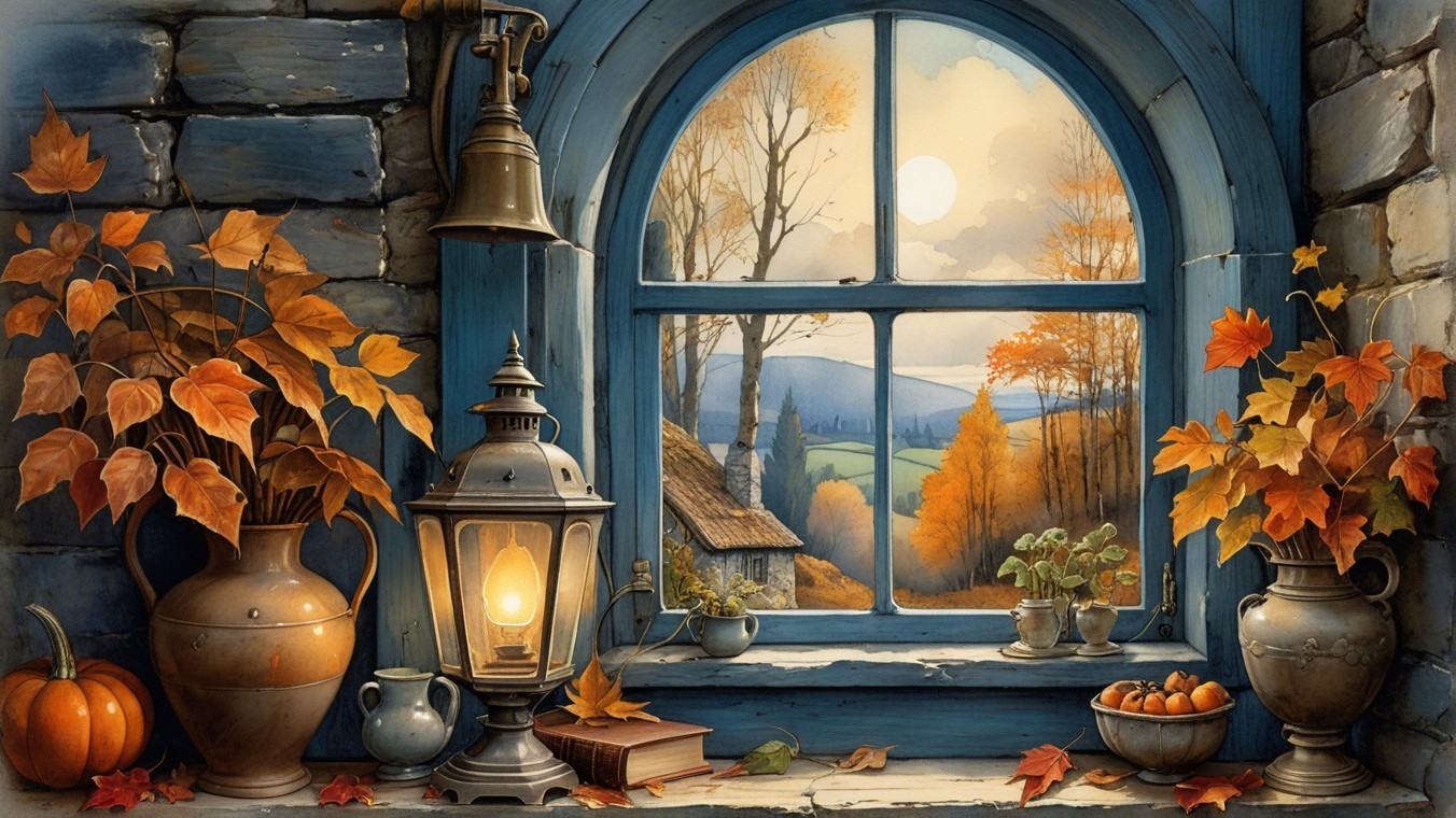 Prompt: *View of a cozy autumn landscape through a charming wooden blue window, overgrown with autumn-coloured plants. Antique lamps, pumpkin, old books, stone walls. Warm golden light. By Anton Pieck.