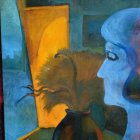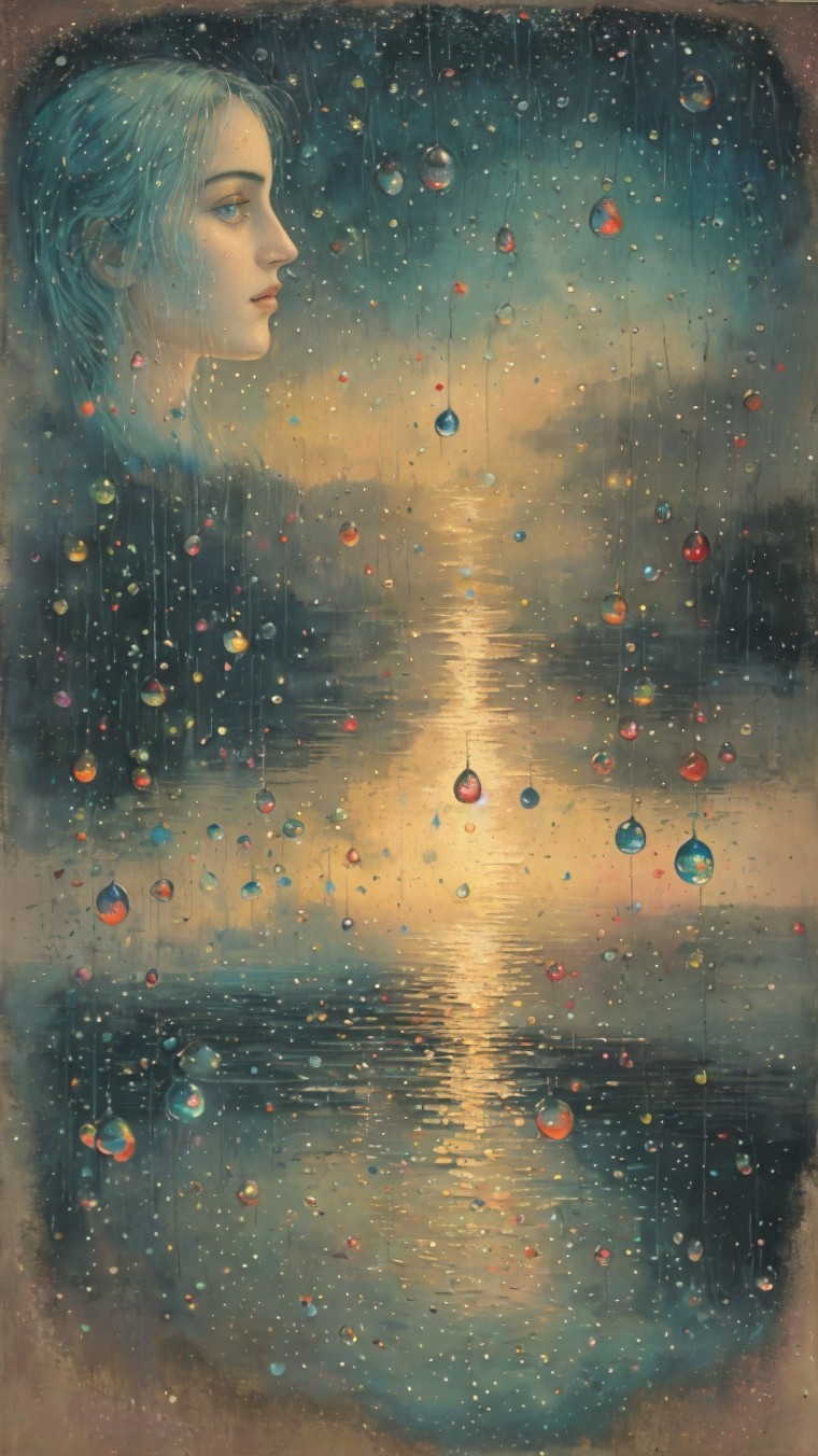 Water droplets dancing, imagining you as a dream. , A moody backdrop creates an atmosphere of ethereal strangeness. High resolution fine detailed textures fine colors scratches, tears, burn marks, cracks in the paint in the mix style of Joan Miro, Gabriel Pacheco, antique extreme canvas textured