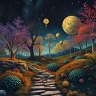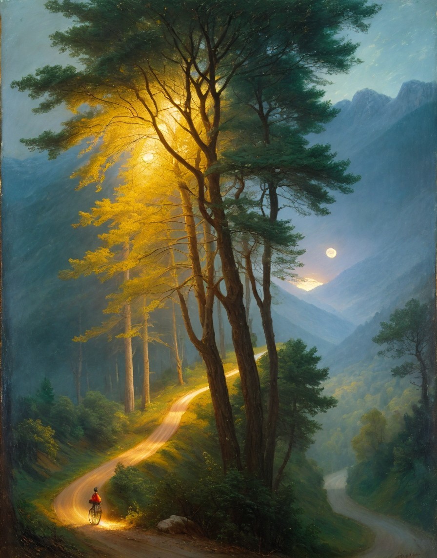 Prompt: A mountain road at night. Full moon. A rider gallops along the road. Branching oak trees with curly shawls of foliage hang along the sides of the road. In the style of Turner.