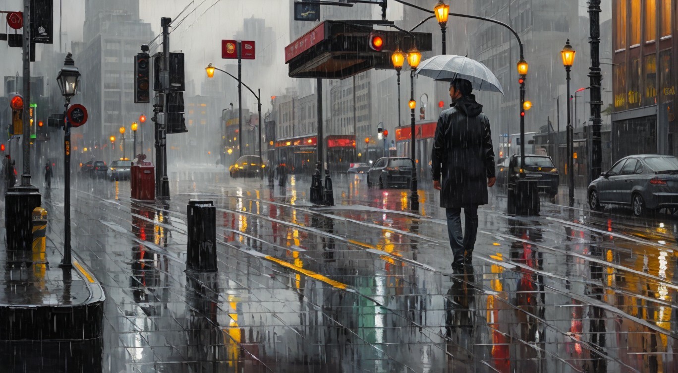 Prompt: A beautiful 40 year old woman dressed in silver satin dress holds a supermoon in her hands amidst a heavy rainstorm falling as silver droplets in a darkening forest.