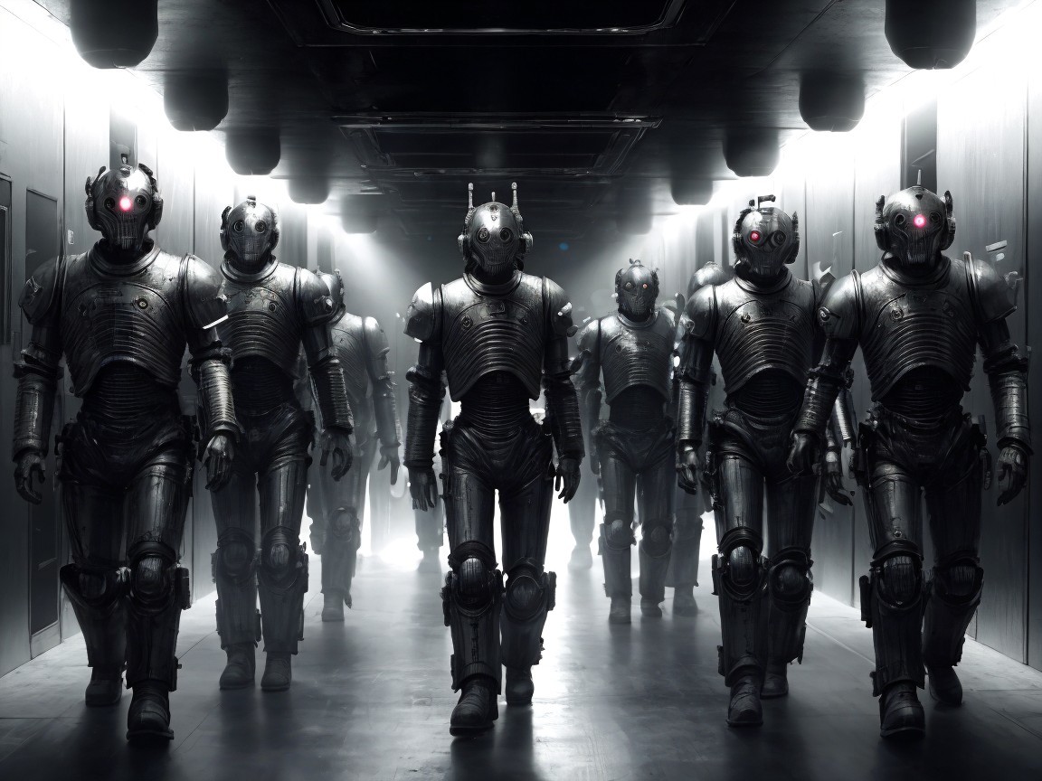 Prompt: Create a horrific abstract art painting of The undead Cybermen in the style of body horror are marching towards the camera in a dark old spaceship corridor. The camera is high looking down at them.