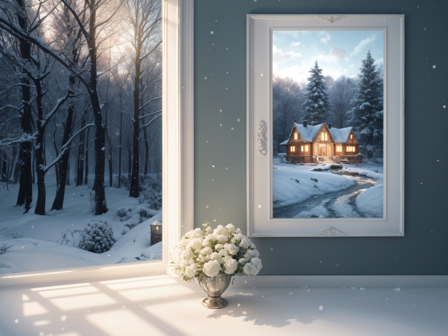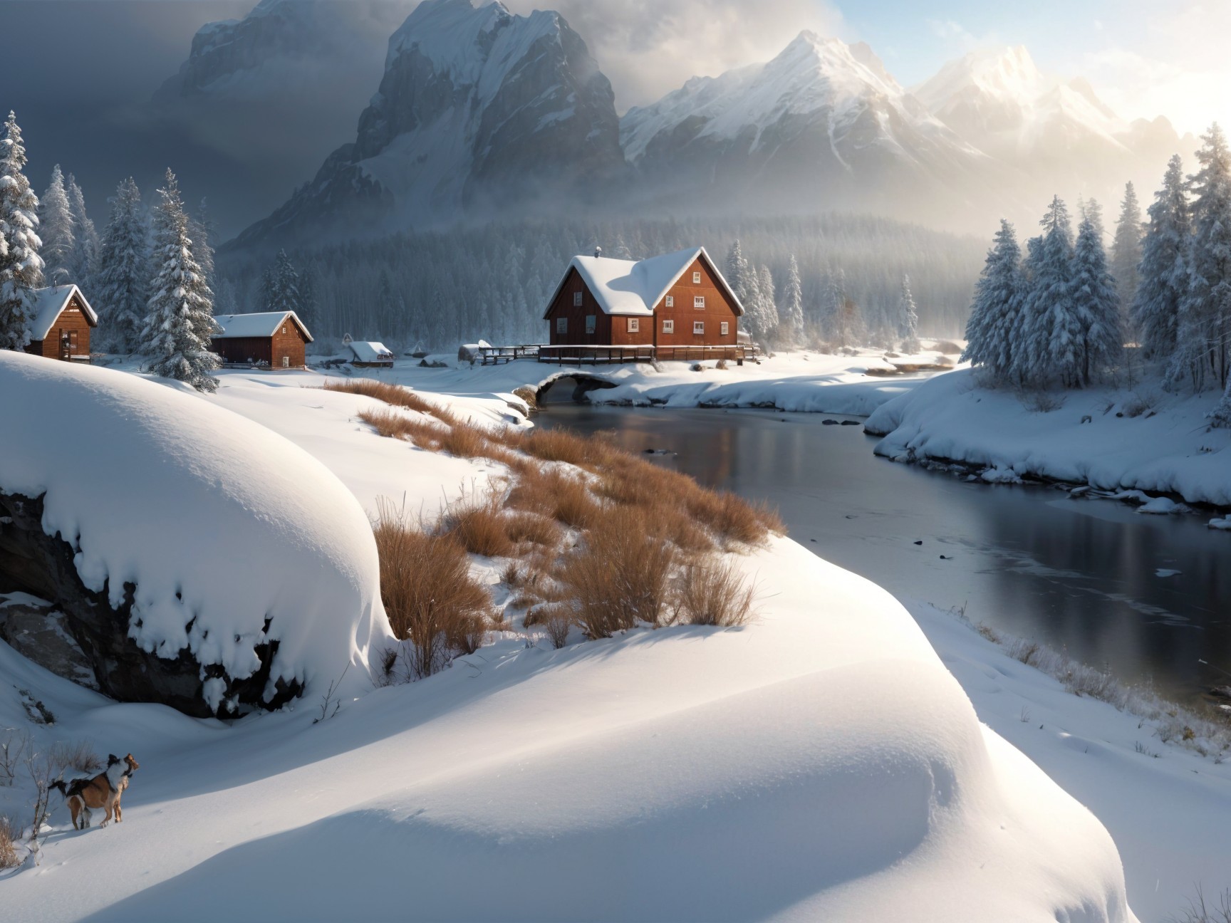 Prompt: Maak een sneeuwberglandschap in de winter met een smal wegje kronkelend door het landschap en ook een riviertje in het landschap en een paar kleine berghutjes langs de rivier