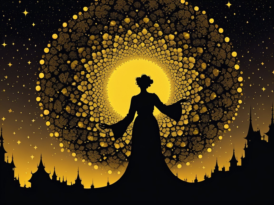 Prompt: minimalistic ilustration of rage by Lotte Reiniger depicted in the perfect fractal style of Mandelbrot, glowing bright colors, stary skyscape background by Mackintosh in dark shades of yellow