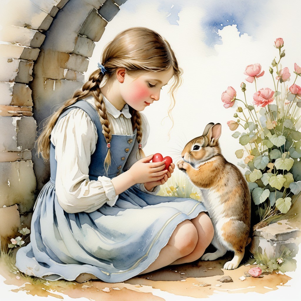 Prompt: A beautiful watercolor illustration depicting a little girl with a broken heart, crafted by artists Carolyn Blish, Waterhouse, and Beatrix Potter. The soft pastel colours lend a dreamy quality to the artwork, evoking a sense of melancholy and longing. The broken heart is portrayed with delicate brushstrokes, capturing the pain and vulnerability of heartbreak. Despite the sadness depicted, there is a subtle beauty in the way the colors blend and flow, creating a mesmerizing composition that invites the viewer to reflect on the complexities of love and loss. This watercolor illustration is a poignant reminder of the fragility of the human heart, rendered with sensitivity and grace by the talented artists