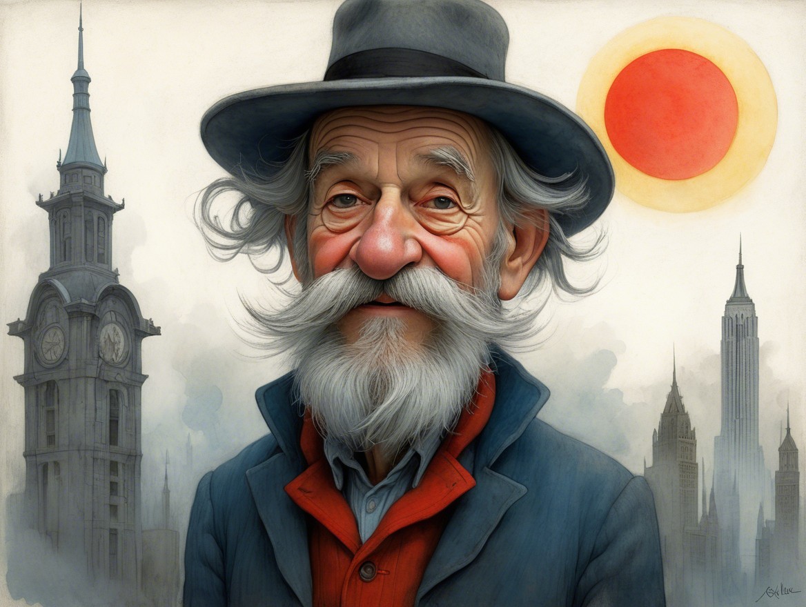 Prompt: Escape from Seattle ~ Paul Klee, James Jean, Anton Pieck, Erik Johansson, Charles Addams. A old man cartoon resident is an optimist, disheveled, shaggy, mustachioed, with crazy hair and a hat, counting on happiness. Caricature. Like a child's drawing. Minimalism, simplicity, charcoal drawing, whirlwind of colors, blue and red soot, sketching, bleached background, grunge, alcohol ink, play of light and shadow, quick sketch, unusual horror, watercolor, dark art., terror