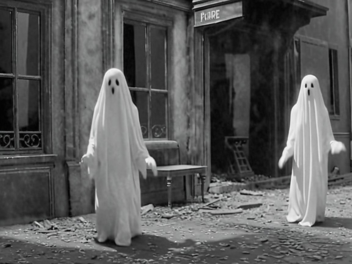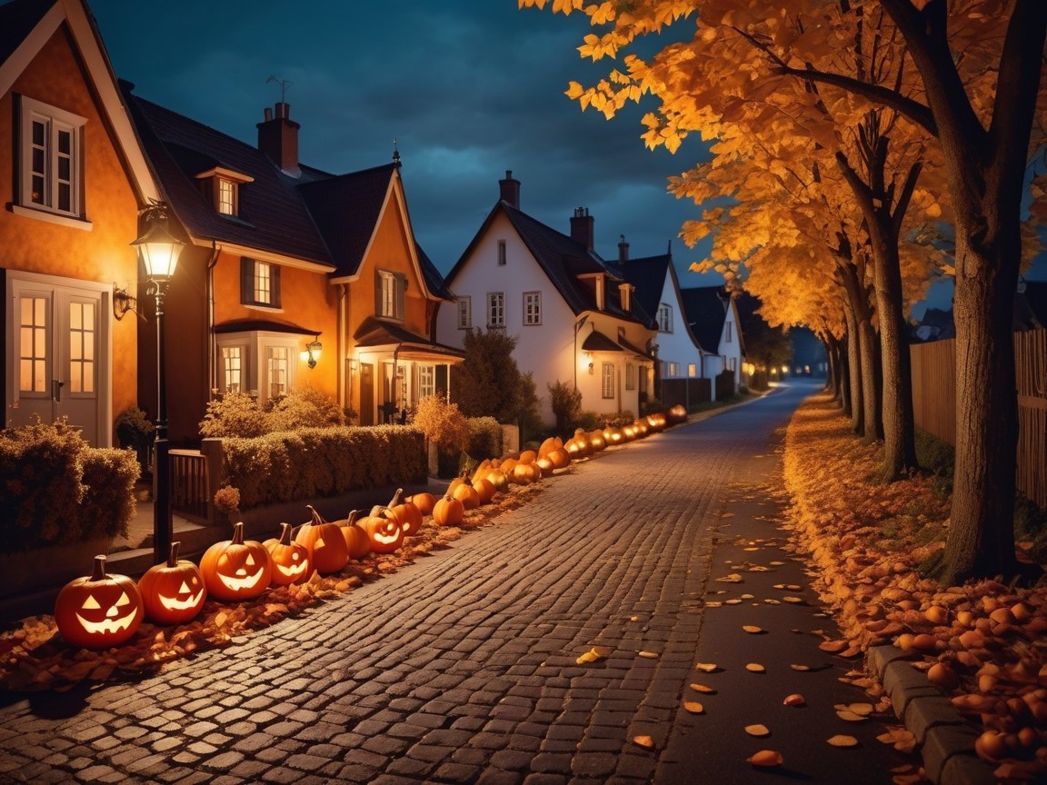 Prompt: A cozy Autumn Evening mood on Halloween, pumpkin lantern are placed before houses through a little village street, Street lanterns are on, Trees along the road, leaves falling from the trees in the wind, vintage style