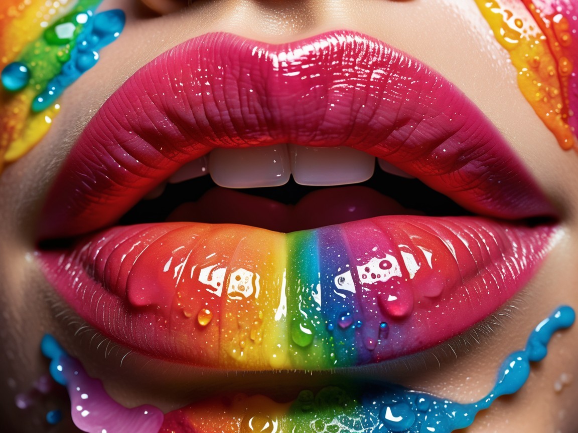 Prompt: a vivid blend of flavors and colors where human lips savor a rainbow of dew infused with floral and cosmic notes. These surreal images dazzle with a luminous and abstract beauty