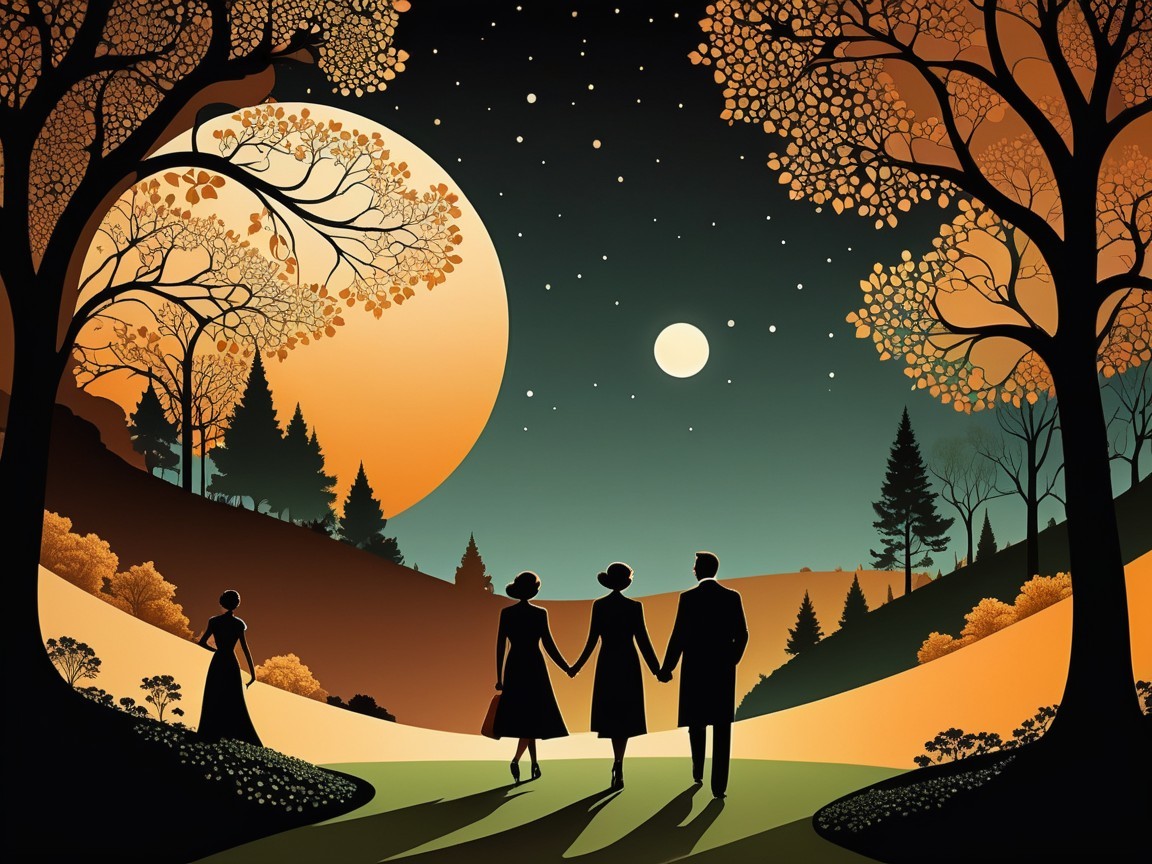 Prompt: minimalistic ilustration of stroll in the park by Lotte Reiniger depicted in the perfect fractal style of Mandelbrot and Huy Duyhn, glowing earth colors, art deco background by Mackintosh in metalic colors