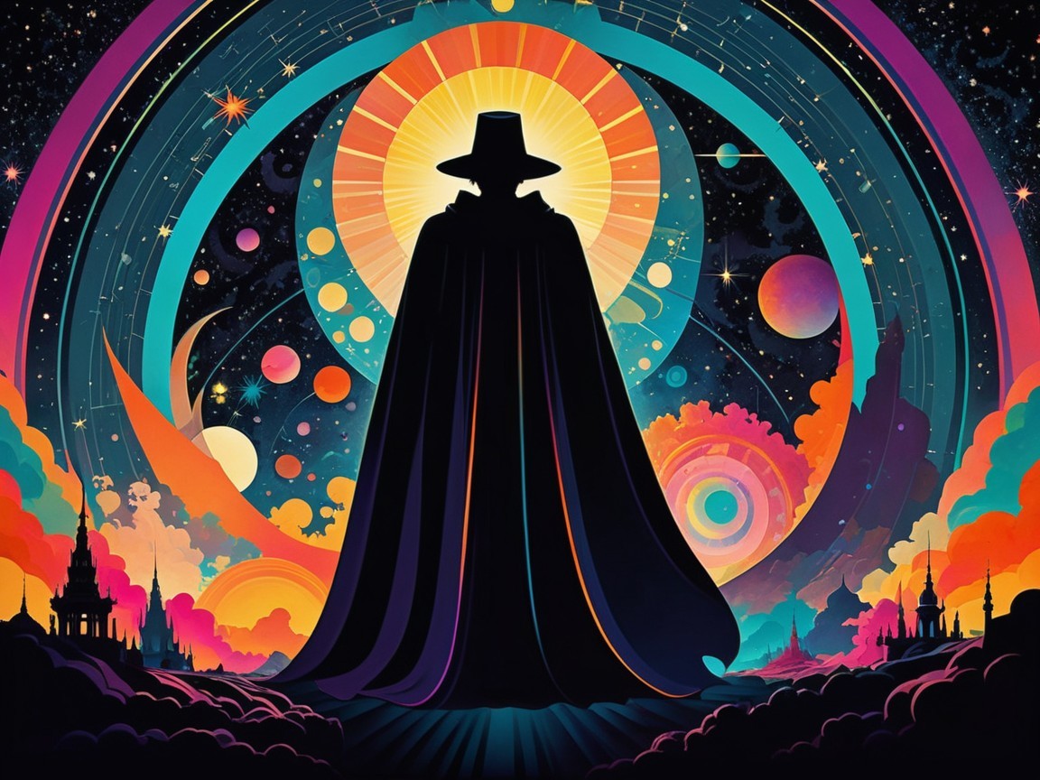 Prompt: epic vintage poster of a scifi movie from the 50's by Lotte Reiniger depicted in the perfect fractal style of Mandelbrot, Julia, Wassily Kandinsky, Alphonse Mucha, glowing neon colors, dramatic starcape background