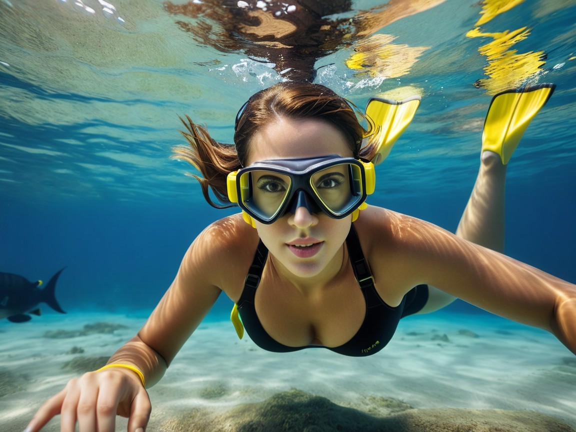 Prompt: A woman wearing diving goggles underwater. Viewed directly from the front. She is looking directly into the camera. She is wearing yellow fins on her feet. Her legs are slightly bent upwards.