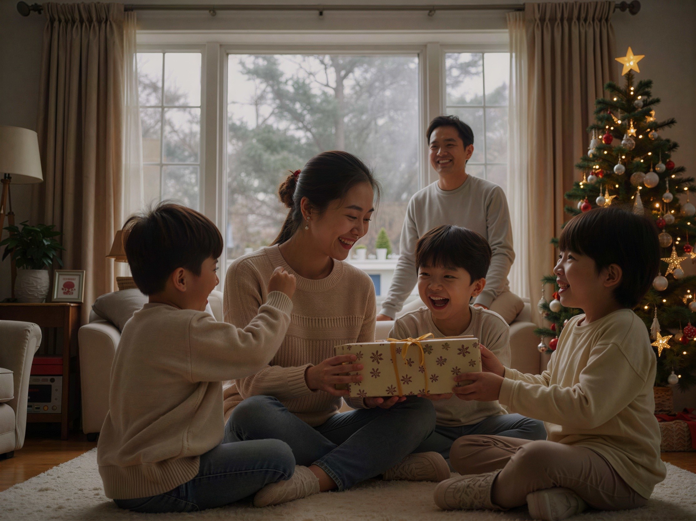 Prompt: A heartwarming scene in a middle class living room on Christmas morning. The living room is comfortably furnished. The picture window looks out on a wintry suburban lawn. Excited Korean children give a giftwrapped gift to their Korean mother. The mother looks pleased as she accepts it. The father stands in the background, smiling.