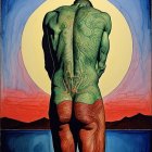 Prompt: A beautiful strange oil painting of a man in his 30s crawling through a long colourful mirrored tunnel, covered in weird markings. Surreal, wonderful, dark.