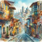 Prompt: Narrow, whimsical cobblestone street between colorful old buildings, leading to a view of an urban skyline with stacked roofs, domes, and architectural details, fractured and geometric forms, strong cubist influence, watercolor painting