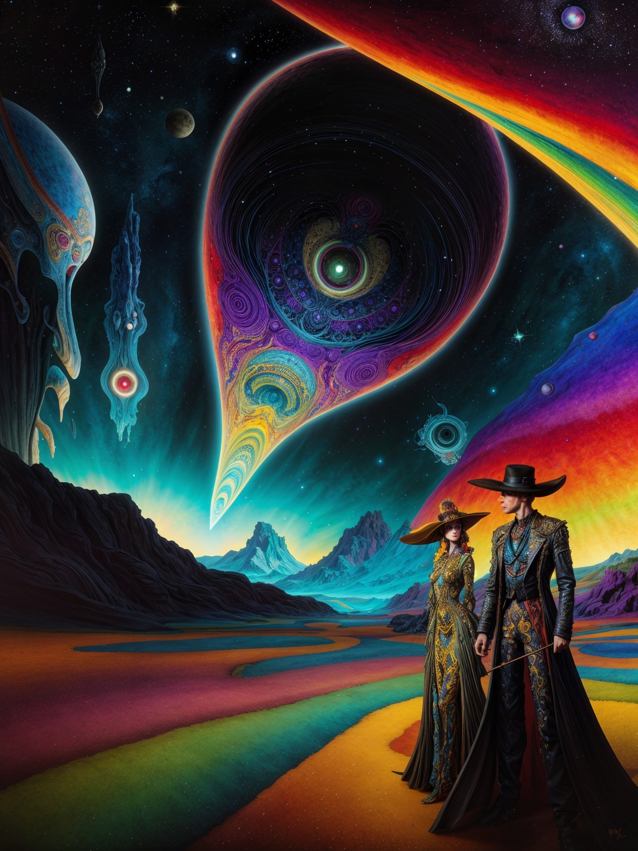 Prompt: Alien beings in the blended styes of Kelley Freas and Richard M. Powers in a landscape featuring the blended styles of Dali, Kandinsky and Jean-Baptiste Monge
