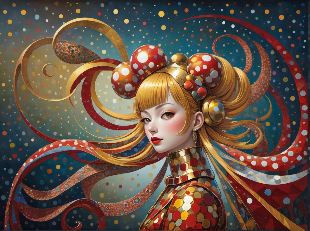 Prompt: Portrait of robot, golden hair, red lips, styled by Yayoi Kusama, Ben Heine and Paul Klee, with low poly, polka dotted, paisley and striped elements, HQ, 8k, Chrome, metallic bronze brass, Victor vasarely,