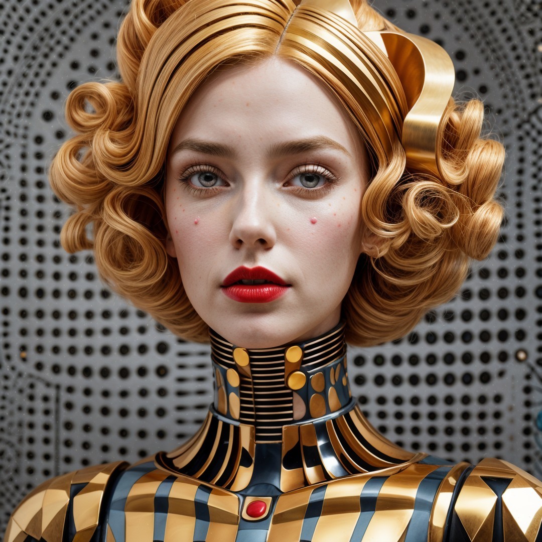 Prompt: Portrait of robot, golden hair, red lips, styled by Ben Heine and Paul Klee, with low poly, polka dotted, paisley and striped elements,Chrome, metallic bronze brass,by folk art,Victor vasarely,