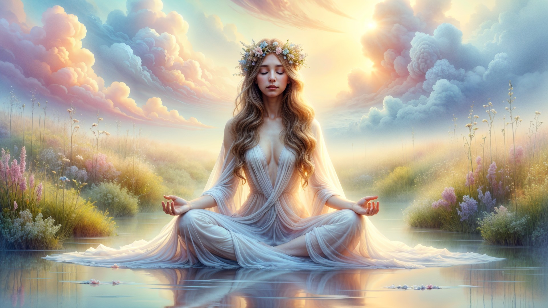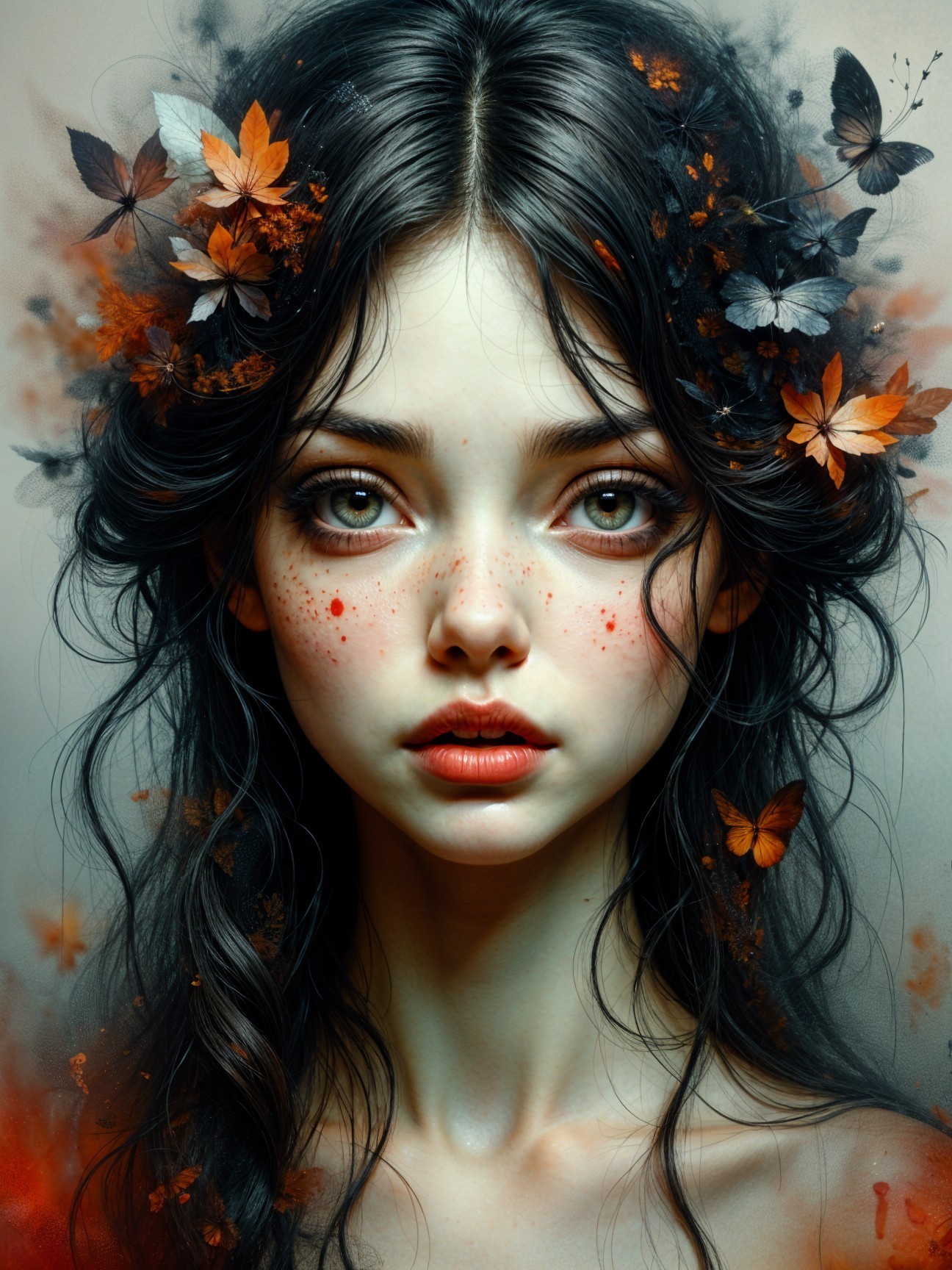 Prompt: A serene portrait of a young woman with long, flowing hair adorned with a crown of soft-colored roses and delicate butterflies. She has striking blue eyes and a gentle expression, framed by ethereal wisps of translucent fabric. The background features soft hues of blue and gray, accentuated by floral motifs, creating a dreamy and tranquil atmosphere.