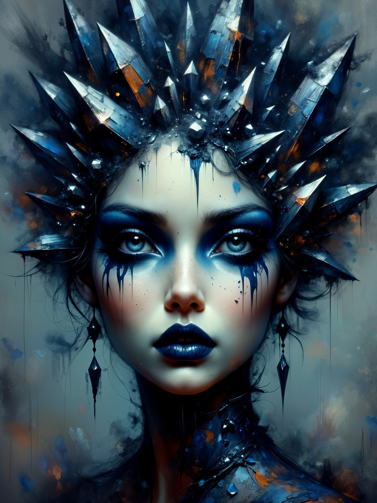Prompt: Create an image of a person with a striking and dramatic appearance. The figure should have a completely blackened face, merging seamlessly into a dark background. Feature an ornate crown adorned with sharp black and clear crystals atop their head. The hair should be tied back, complementing the gothic aesthetic. The eyes should be large, with dark eyeliner, and have a mysterious, haunting quality, enhancing the mood. Include intricate tear-like designs in deep blue or black, cascading from the eyes, and ensure the lips are also dark, perhaps with smudged edges that add to the overall ethereal and eerie vibe. The background behind the figure should be plain white to create contrast and highlight the dark elements of the composition. The overall effect should evoke a blend of elegance and darkness, with a focus on the crown and the striking features of the subject.