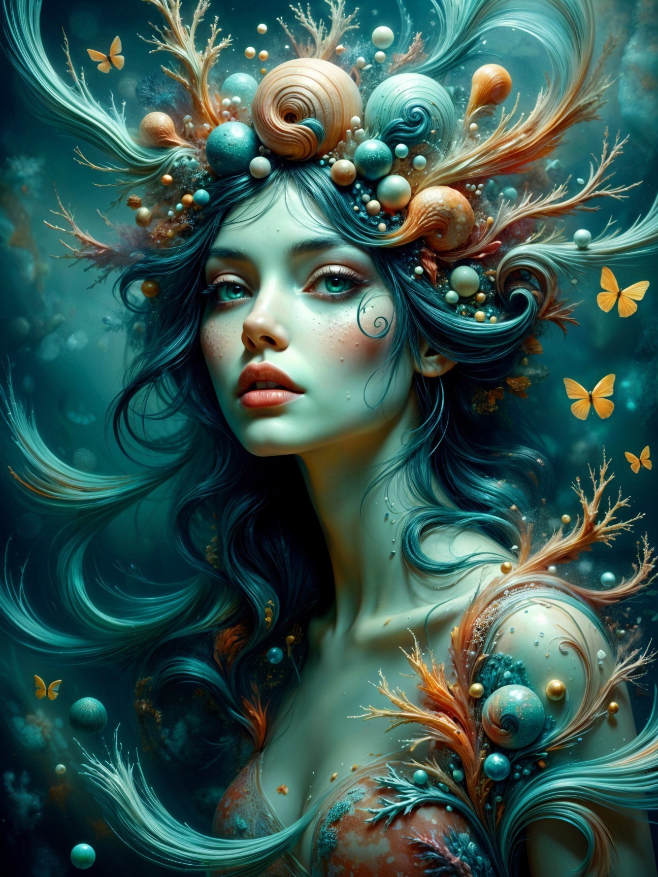 The character is adorned with a crown made of various seashells, starfish, and coral, which adds to its ethereal presence. The shells are intricately detailed, showcasing shades of beige, white, and soft pink. The backdrop is a deep, dark blue-green ocean, filled with floating bubbles that enhance the underwater ambiance.