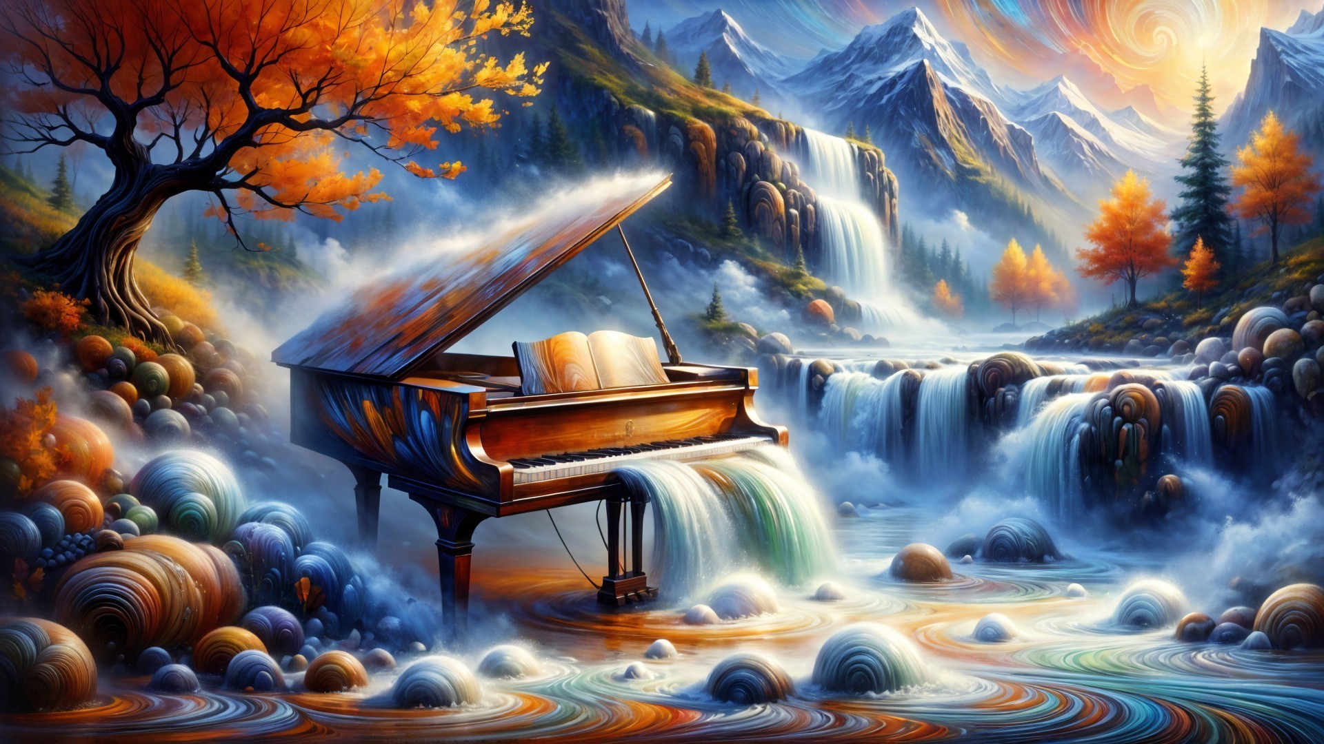 The background reveals majestic snow-capped mountains under a partly cloudy sky, where beams of sunlight break through, illuminating the scene with a divine radiance. In the mid-ground, green meadows and autumn trees—their foliage ablaze in fiery reds, golds, and oranges—frame the piano like a natural concert hall. Mist rises gently from the water, catching the sunlight and refracting it into subtle prisms.