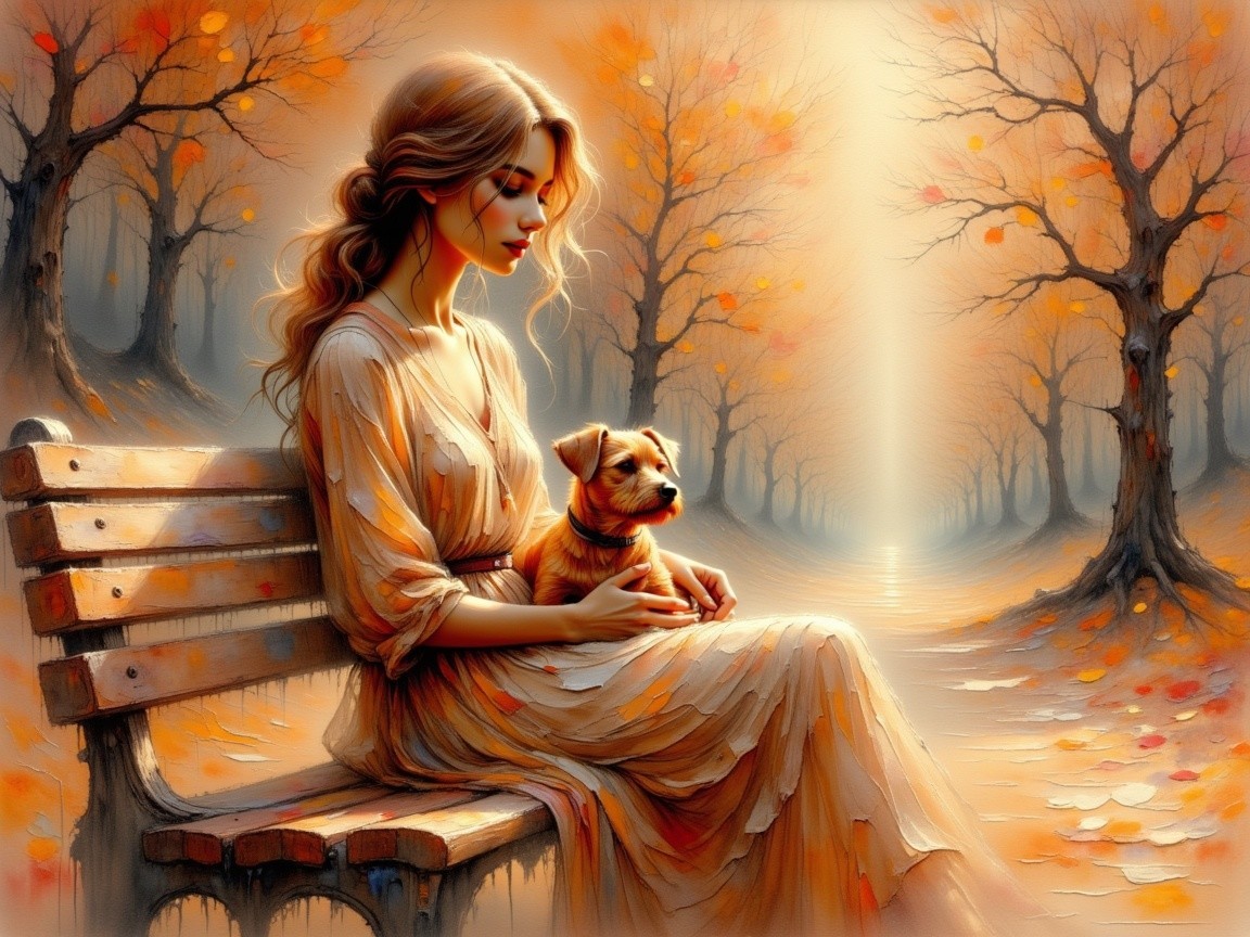Prompt: Airbrushed watercolor painting centered, a pretty 30-year-old chic, distinguished woman with curly auburn hair, wearing a long-sleeved brown and beige striped dress and a russet-colored scarf, chaussures noires a talons , sitting on a wooden bench in an autumn park. She holds her small Jack Russell dog on her lap. Ethereal fantasy, hyperdetailed mist, in the style of Thomas Kinkade, with soft, glowing light.