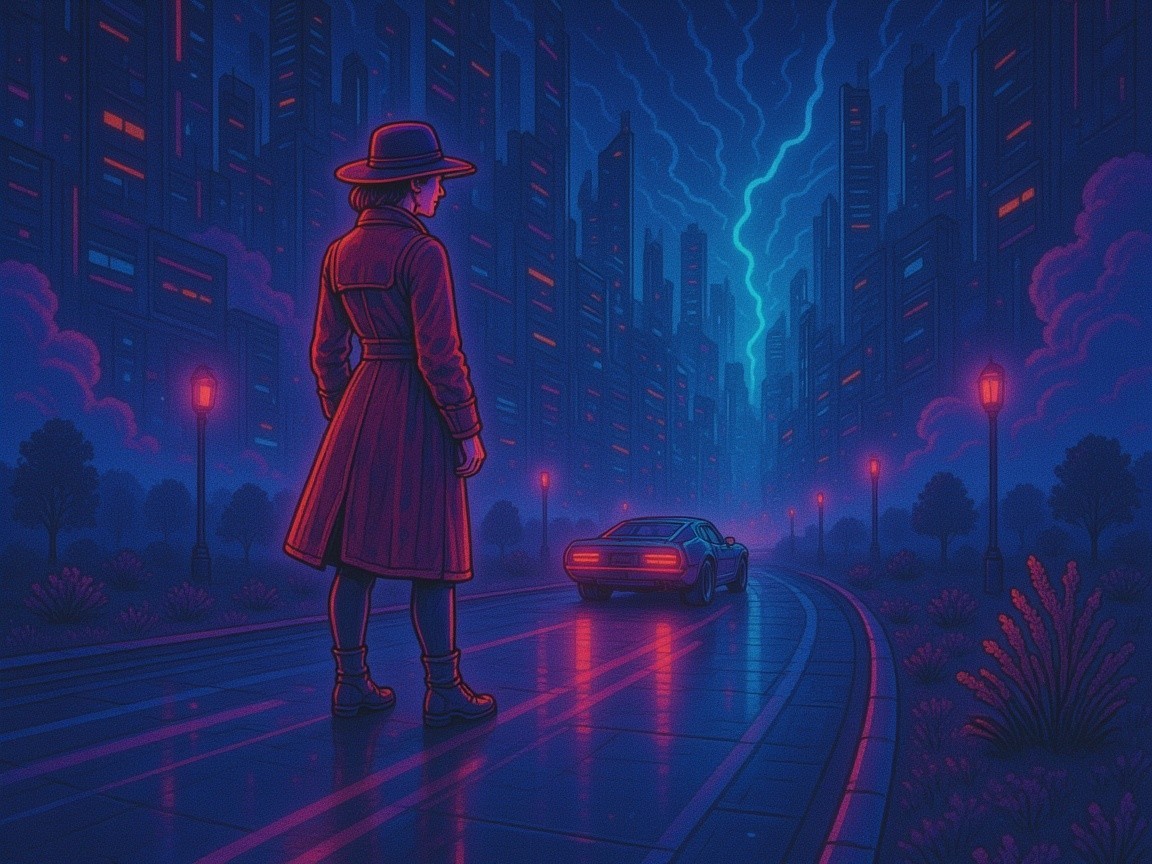 Prompt: A mystical woman with flowing, wavy hair adorned with flowers gazes over her shoulder. She wears an elegant, shimmering red dress that swirls around her, blending seamlessly with a colorful, enchanted garden filled with vibrant roses and glowing orbs of light. In the background, a full moon illuminates the scene, while a distant figure walks along a softly lit path, enhancing the dreamlike atmosphere of the image.