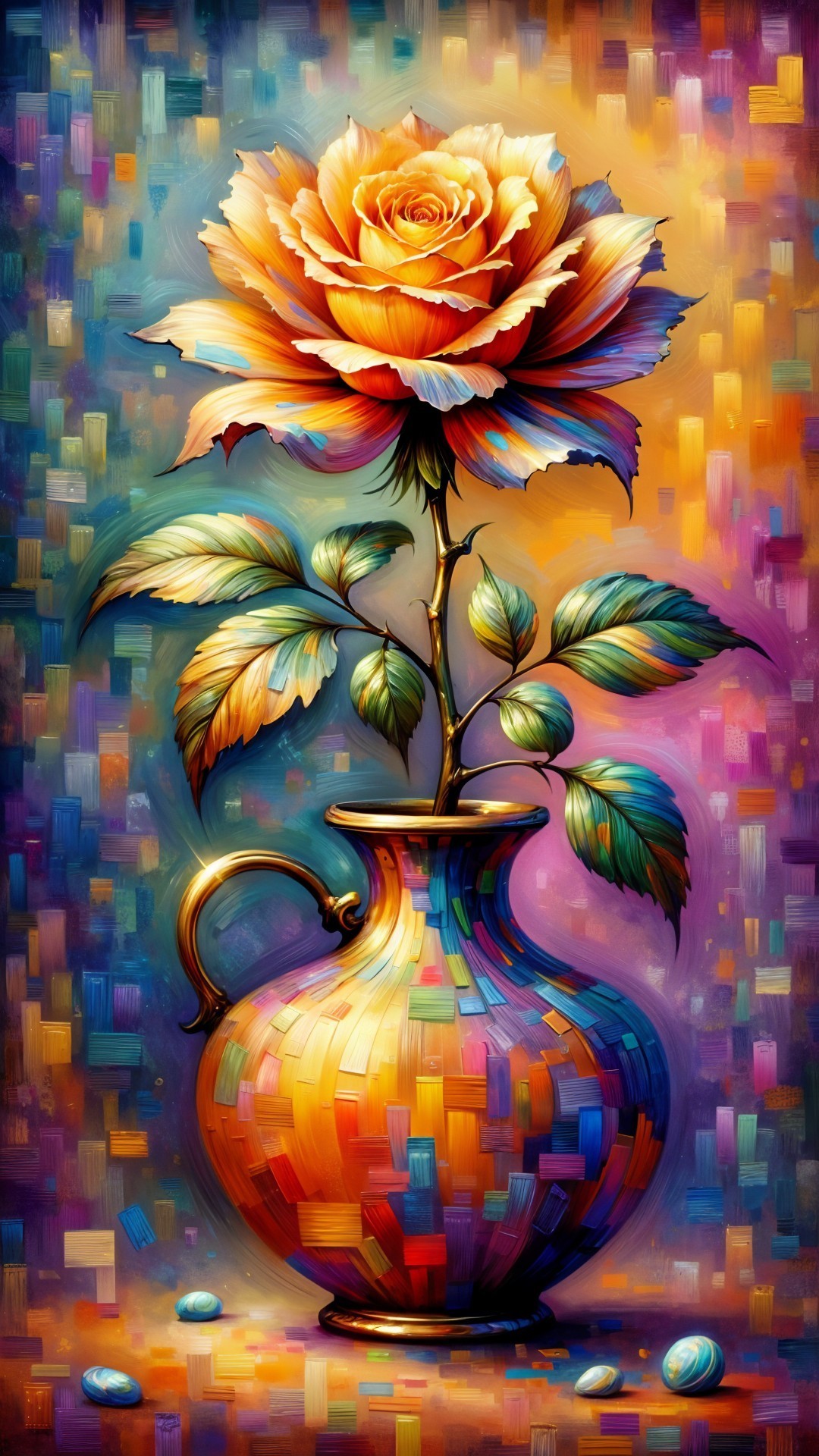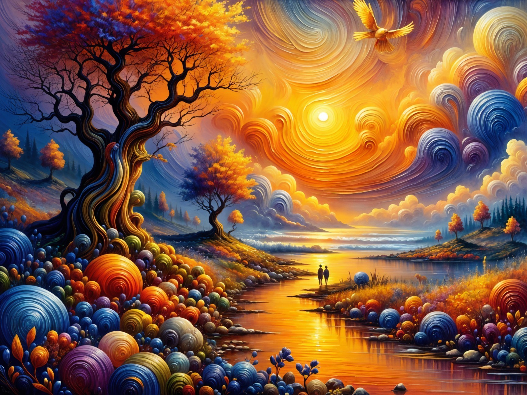 Prompt: The sun is setting, giving a soft warm glow, there is a narrow path in a quiet forest. Path is lined with flowers with vibrant colors and leaves swaying gently , Serenity Beach Bliss at Sunrise A serene beach scene showcases gentle waves lapping at the shore, framed by scarce vegetation and vibrant blue and red stylized flowers under a peaceful sunrise sky. A bird soars above, enhancing the tranquil atmosphere. An orange sun rising above horizon. Gentle wet in wet watercolour painting.Masterpiece , The path leads to waterfall and a pond, reflecting the sun’s soft glow. oil painting by James Gurney neo-impressionism expressionist style oil painting, smooth post-impressionist impasto acrylic painting, thick layers of colourful textured paint
