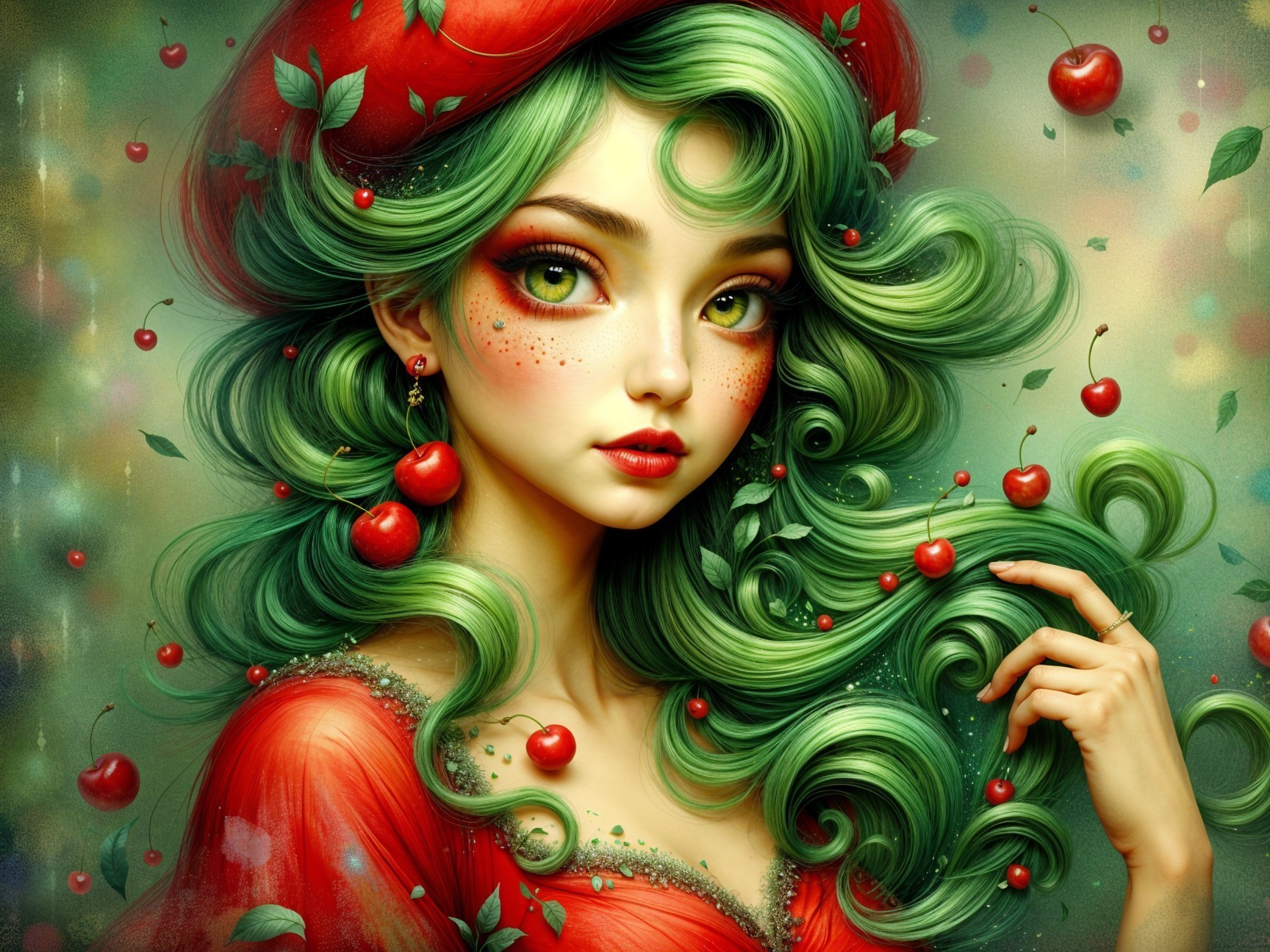 Her lips are plump and painted in a rich coral shade, creating a captivating contrast with her features. She has round, shiny earrings shaped like cherries, adding a playful element to her look. The background is a vivid green, with subtle textures and patterns that suggest a natural, organic feel, enhanced by whimsical illustrations of cherry fruits hanging in the design. The overall composition combines a modern, whimsical aesthetic with fresh and fruity vibrant colors, emphasizing the character's expressive personality.