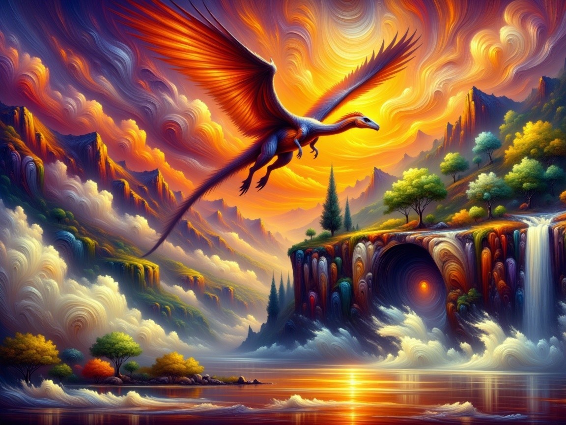 Prompt: Under a bright crimson-gold sky, a vividly feathered pterosaur with iridescent wings sweeps low over glowing sunlit clouds, its shadow gliding across a towering cliff face crowned with lush emerald forest. Sparkling silver waterfalls cascade beside a hidden stone archway, partly veiled in swirling mist, all bathed in warm, radiant daylight, photorealistic.