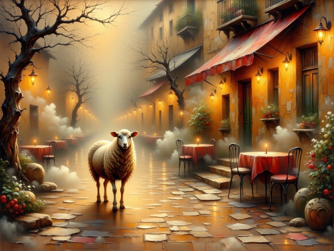 Prompt: In pale gold dawn, a lone sheep with soft wool pauses on an empty cobblestone street, ears perked toward a distant bell. Gentle mist curls between sunlit stones. Warm lamplight glows from shuttered windows onto a weatherworn red café chair with peeling paint, beneath ornate wrought-iron balconies, scene bright and vivid, photorealistic.