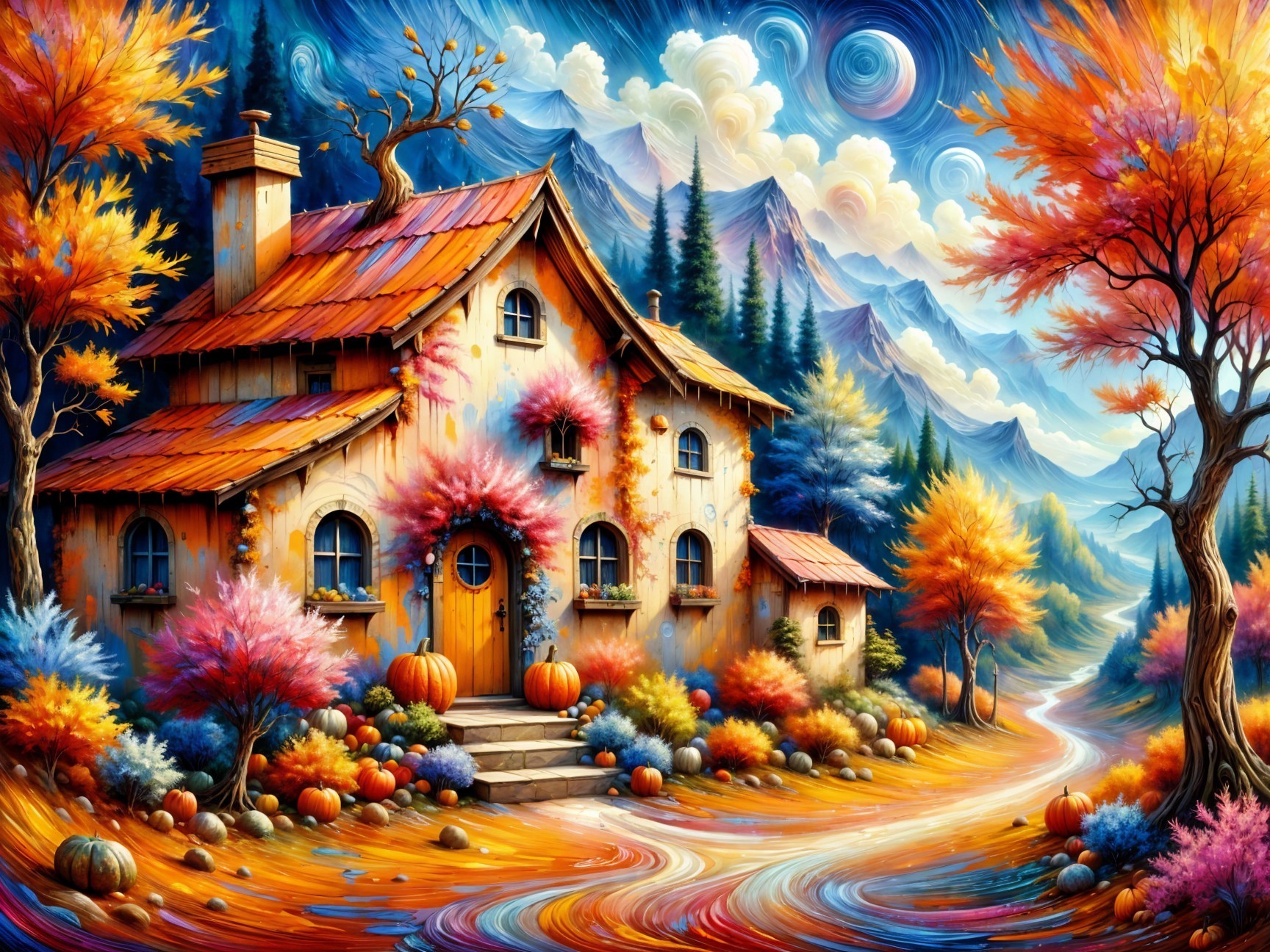 Prompt: A vibrant gouache painting in a wet impasto style, mixed with wet oil paint, features textures of small pink gingham checks framed by thick white lace. At the center of the image is a large, pumpkin-shaped cottage with an orange tiled roof (play with textures), small windows framed in small pink gingham checks surrounded by white lace (play with textures), and a large, stylized brown wooden front door with four steps leading up to it. The facade is white stucco (create small white dots to highlight the stucco) with autumn leaves beneath the windows, and the door frame matches the window frames. In the background is a beautiful forest landscape with a blue sky dotted with small white clouds, lush autumn-colored trees, and pumpkins on the ground with the same pattern as the window and door frames, bordering a paved path, ethereal fantasy hyperdetailed mist Thomas Kinkade, trending on Artstation Unreal Engine 3D shading shadow depth