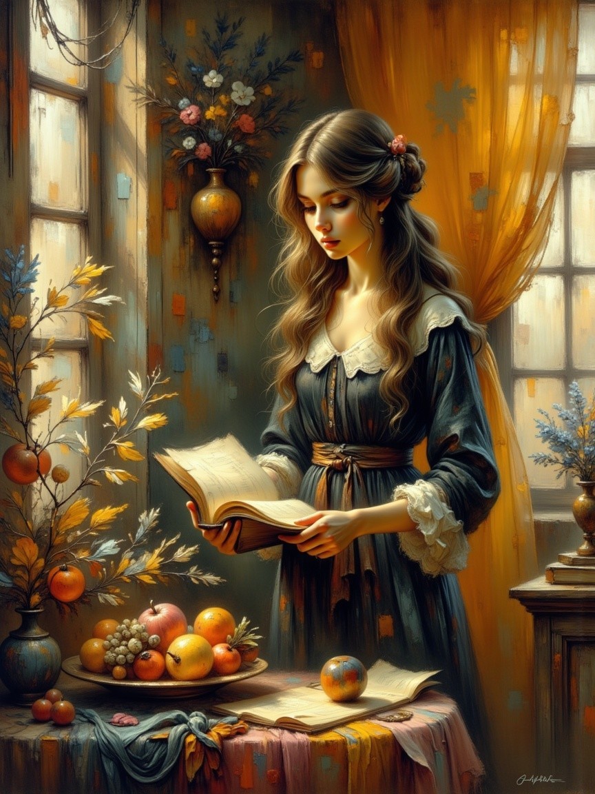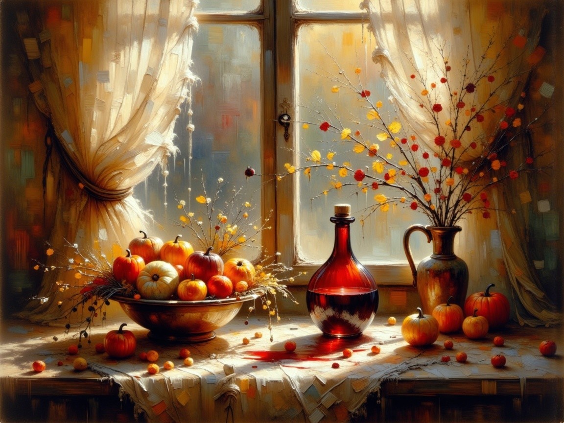 Prompt: Impressionist Watercolor, ink and alcohol wash, Create a still life with bowl of autumn veggies and a carafe of red wine on a windowsill. The old cottage room is dark, apart from the morning light coming in from a window and a light breeze moving the lace curtains. Some wine spilled on the windowsill. The atmosphere is soft and dusty soft colors. Mystical