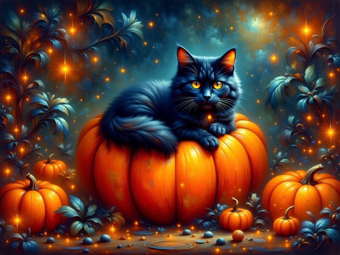 Prompt: A hyper-realistic digital artwork of an adorable, fluffy, black cat sitting inside a pumpkin. The cat's fur is dense and textured, intricately detailed, shimmering with tiny fireflies under a dimly lit starry night sky. Magical pumpkins surround the cat, creating a magical, serene atmosphere.