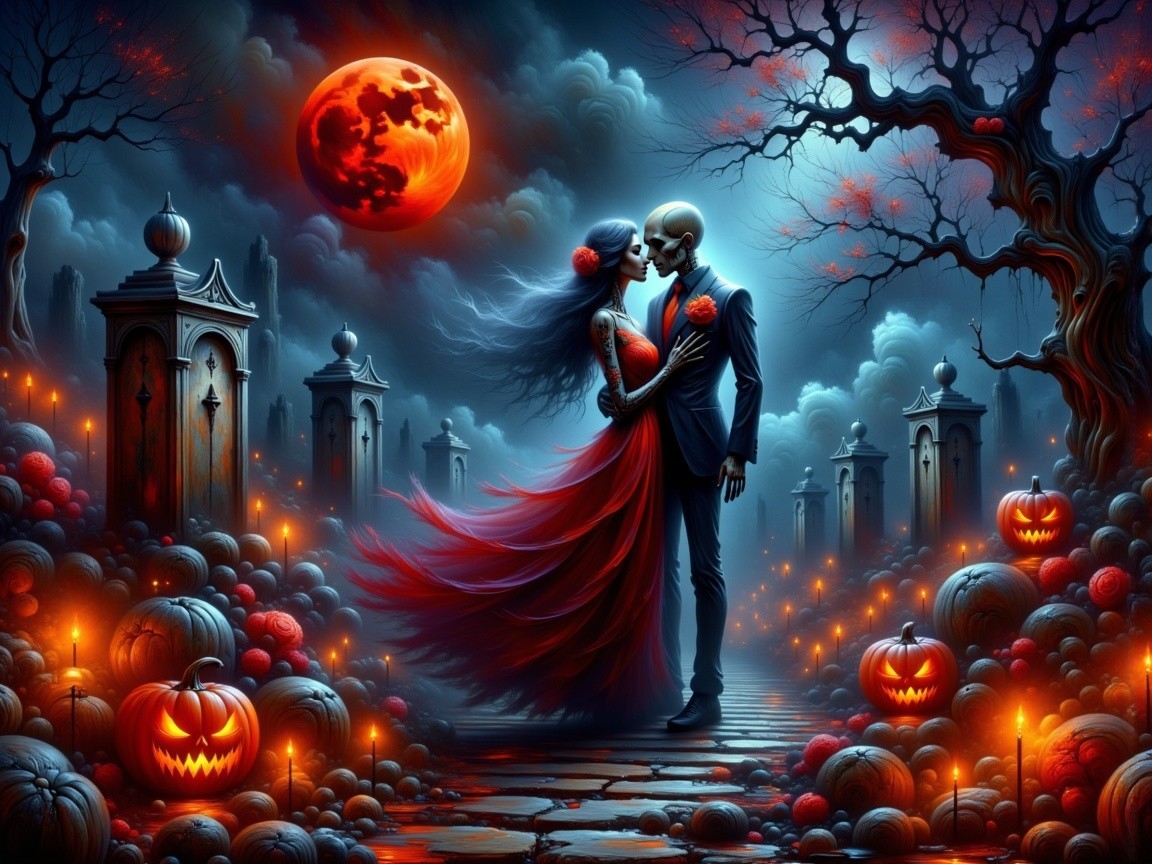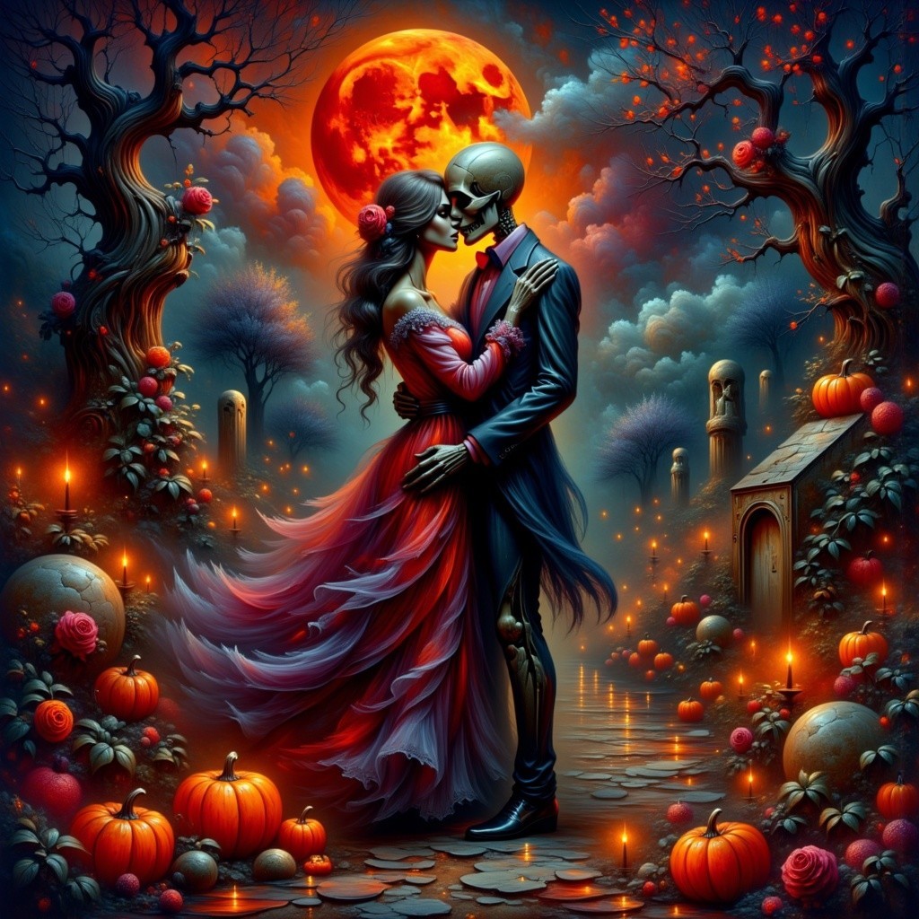 Prompt: A dark magical fantasy Halloween romance scene depicting two skeleton lovers entwined in a tender embrace beneath a blood-red moon. They stand in an ancient, misty graveyard surrounded by glowing jack-o’-lanterns and drifting blue will-o’-wisps. Crimson red roses bloom around their feet and trail up nearby tombstones, their petals glowing faintly with enchantment. The skeleton couple gazes lovingly at each other—one wearing a tattered lace gown adorned with roses and black lace, the other in a dark Victorian suit with a single red rose pinned to his lapel. Candlelight flickers across their bones, and soft moonlight reveals faint magical runes etched into the stone path. The mood is darkly romantic, gothic, and ethereal—where death itself blossoms with love.