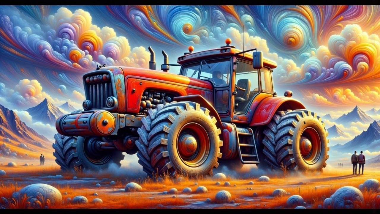 Prompt: A futuristic tractor concept design with a blue and silver color scheme. The vehicle has massive circular wheels with a gradient color pattern transitioning from red to blue. The wheels are connected by a sleek metallic chassis with a blue cab. A large silver cannon extends from the front of the vehicle. The tractor is positioned under a red metal structure with curved supports. The background features a dramatic mountainous landscape with flowing white mist or clouds cascading down the slopes. The sky is bright blue with wispy white clouds. The ground is a smooth concrete surface. The design has a sci-fi aesthetic with clean lines and futuristic elements. The cab has large windows and a metallic ladder leading to the top. The overall composition creates a striking contrast between the industrial elements of the vehicle and the ethereal natural background.