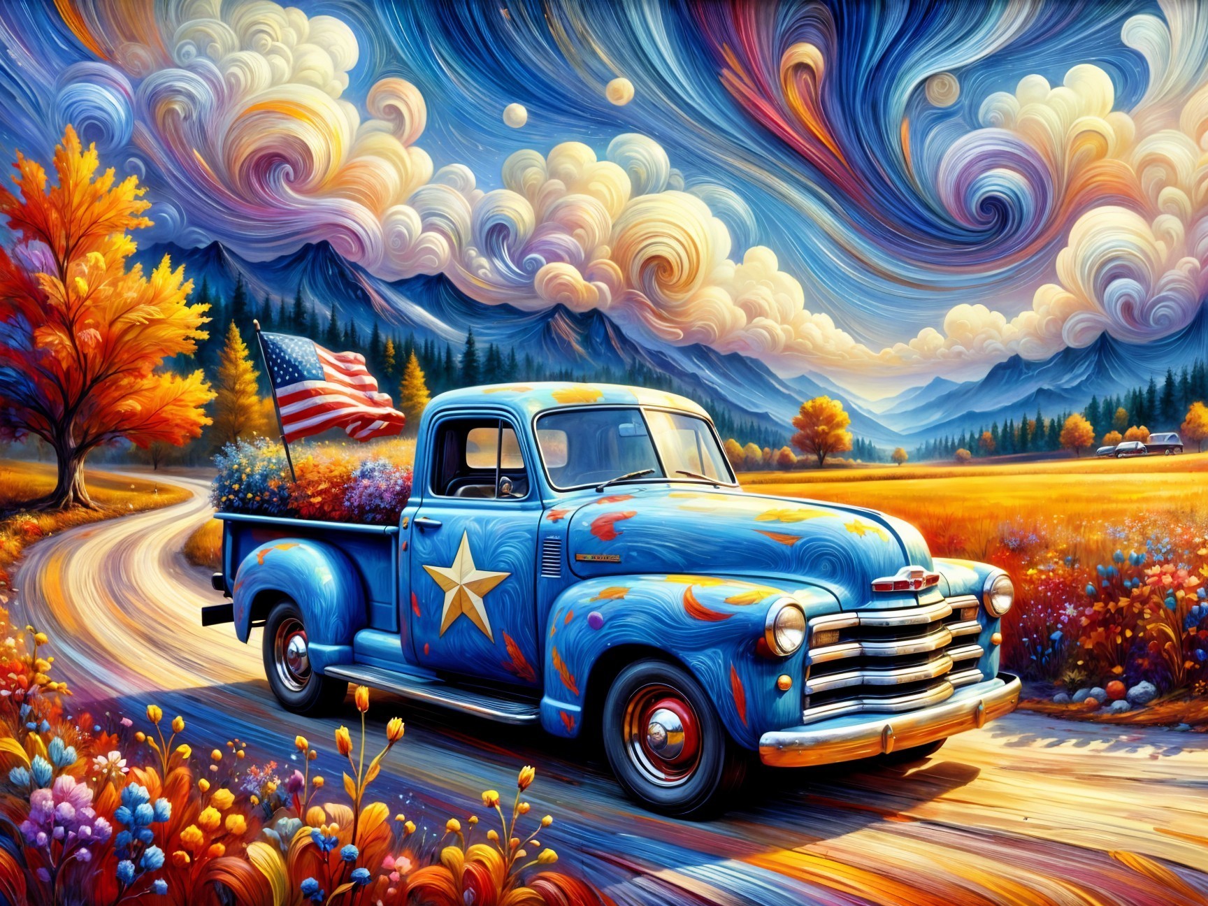 Prompt: A vintage pickup truck painted in vibrant blue with a white star and red accents, parked on a scenic lane. An American flag waves in the bed, surrounded by colorful flowers and autumn trees.